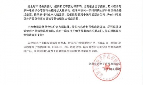 近期以来,“涨价”成为半导体行业关键词。国内外IC厂先后发布涨价函,原因也基本一致。随着供应链情况日益紧张、晶圆及封装资源紧缺且费用大幅上涨、投产周期延长等因素影响,导致成本大幅上升。 元器件涨价必然会向下倒逼消费电子商品涨价。今日,小米官方发布《关于调整小米电视及Redmi电视部分产品型号官方建议零售价格的说明》,正式宣布涨价。 小米称,受全球市场供需变化、疫情和汇率变化等影响,近期包括显示面板、芯片在内的多种电视核心零部件价格持续大幅波动,在未来较长一段时间核心部件报价仍为持续走高。 迫于原材料成本大幅波动,近期将对小米电视部分型号、Redmi电池部分产品型号官方建议零售价格做出相应调整。 小米强调,小米电视始终坚守性价比为纲铁律,将充分利用供应链优势,尽可能保证调价后产品仍极具性价比。 小米