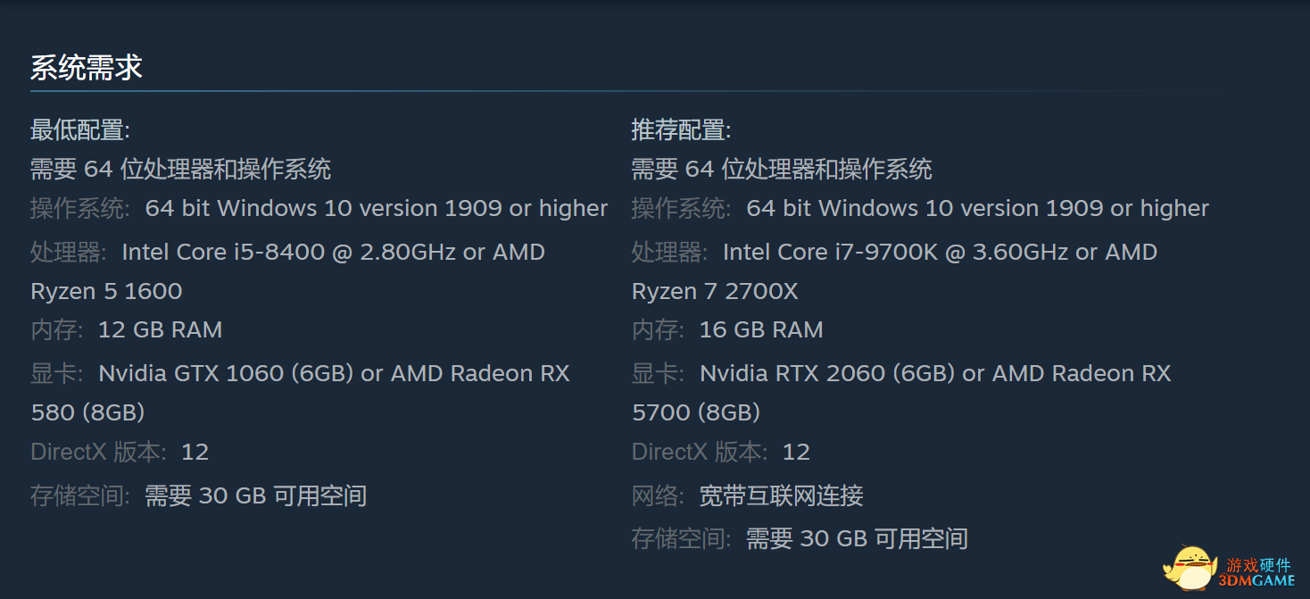 说了这么多游戏内容,接下来,我们再来看一下这款3A大作官方公布的硬件要求。