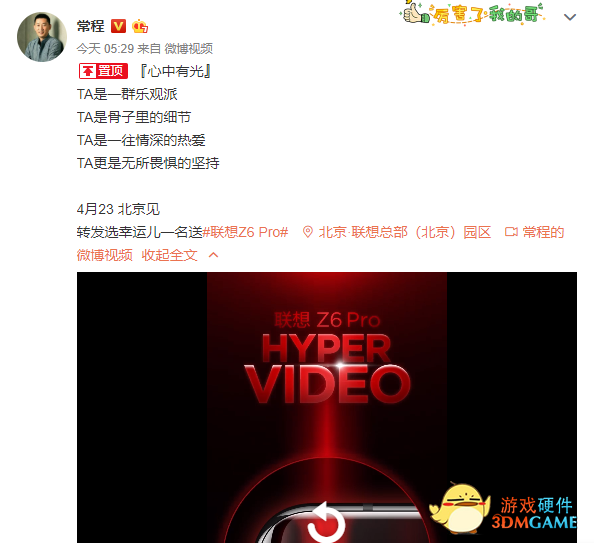联想手机“常掌柜”今日一大早就开始发微博放猛料,宣布新一代旗舰手机联想Z6 Pro 即将在4月23日于北京正式发布。同时还放出一支动感十足的预热视频,表示联想Z6 Pro将应用骁龙855处理器和HYPER VIDEO视频拍摄技术。