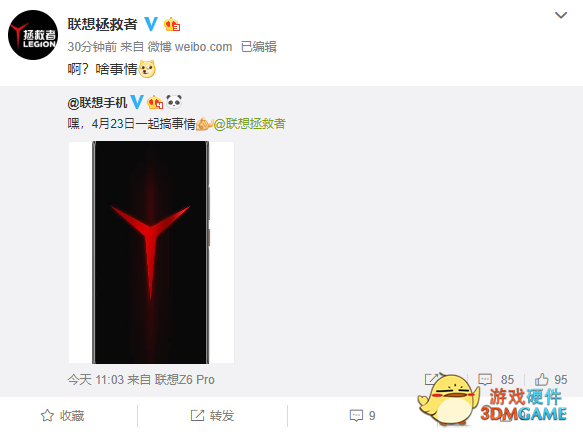 但在宣布手机发布时间后,联想手机的官微又发布了一张疑似新品正面照的图片,但是logo却是联想游戏笔记本——拯救者标志性的“Y”字logo。在这条微博发布之后,联想拯救者官微也进行了转发互动。
