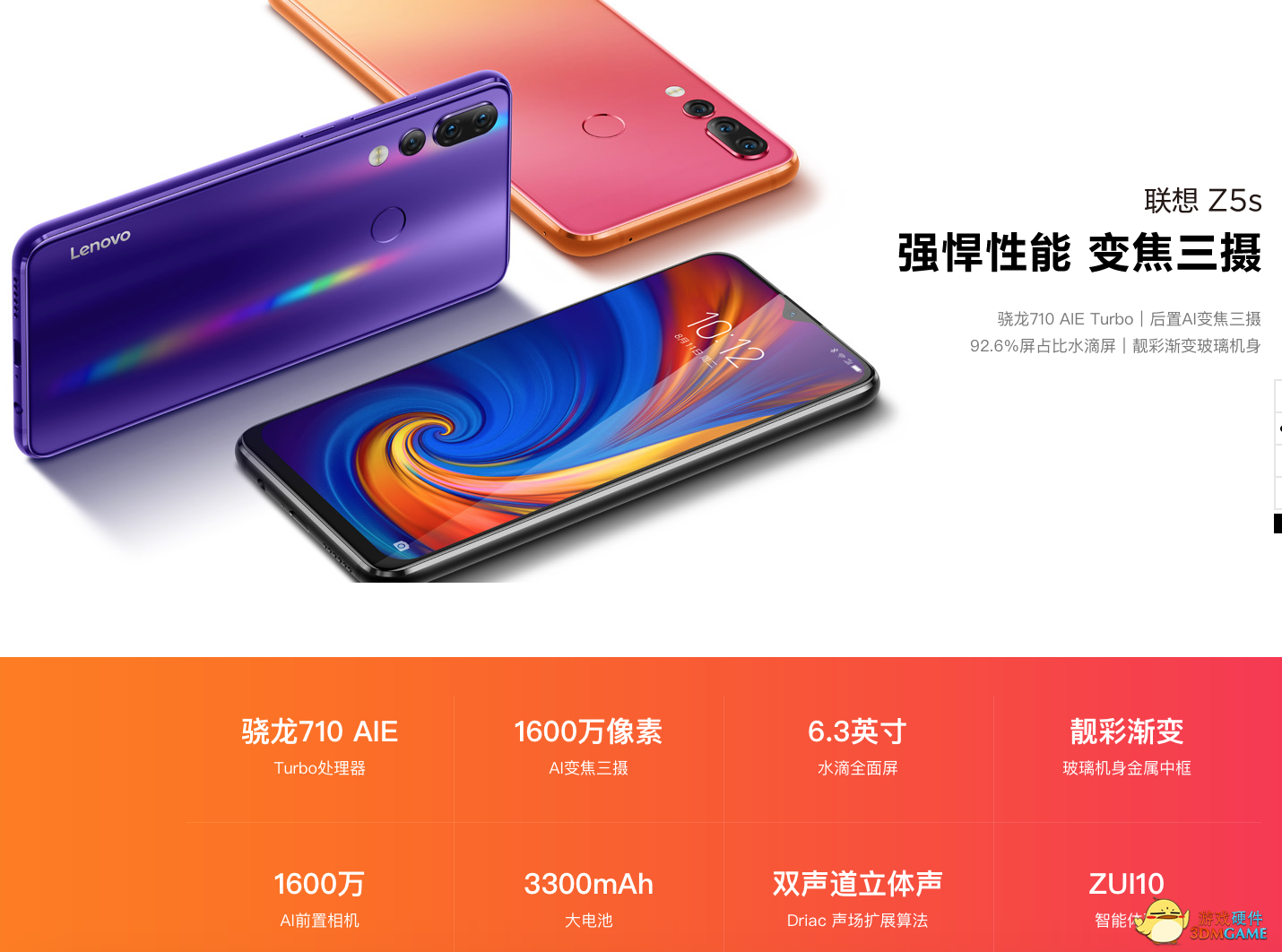 联想Z5s配备变焦三摄,搭载骁龙710 AIE Turbo处理器。骁龙710 AIE Turbo采用了10nm工艺制程打造,搭载了和骁龙845相同的第三代Kryo CPU,最高主频达到2.2GHZ。另外,在AIE引擎、AI运算能力上要比骁龙660提升2倍,同时还具备低功耗的特点。联想Z5s采用了后置三摄设计。分别是1600万像素主摄,光圈大小为F1.8;800万像素光学无损变焦镜头,其支持两倍光学变焦,并支持HDR逆光拍照。