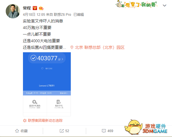 4月18日誓师大会后,常掌柜又在微博爆料:联想Z6Pro安兔兔的跑分数据超过40万,直接碾压小米9的38万。