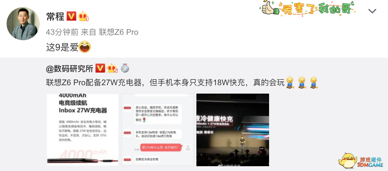 探究事情的起因,是联想的新款机型Z6 Pro配备了一个27W充电器,但手机本身输入的功率是18W左右。对此,有网友调侃说,“这总比苹果支持18W快充,却配一个5W的充电器良心多了”。