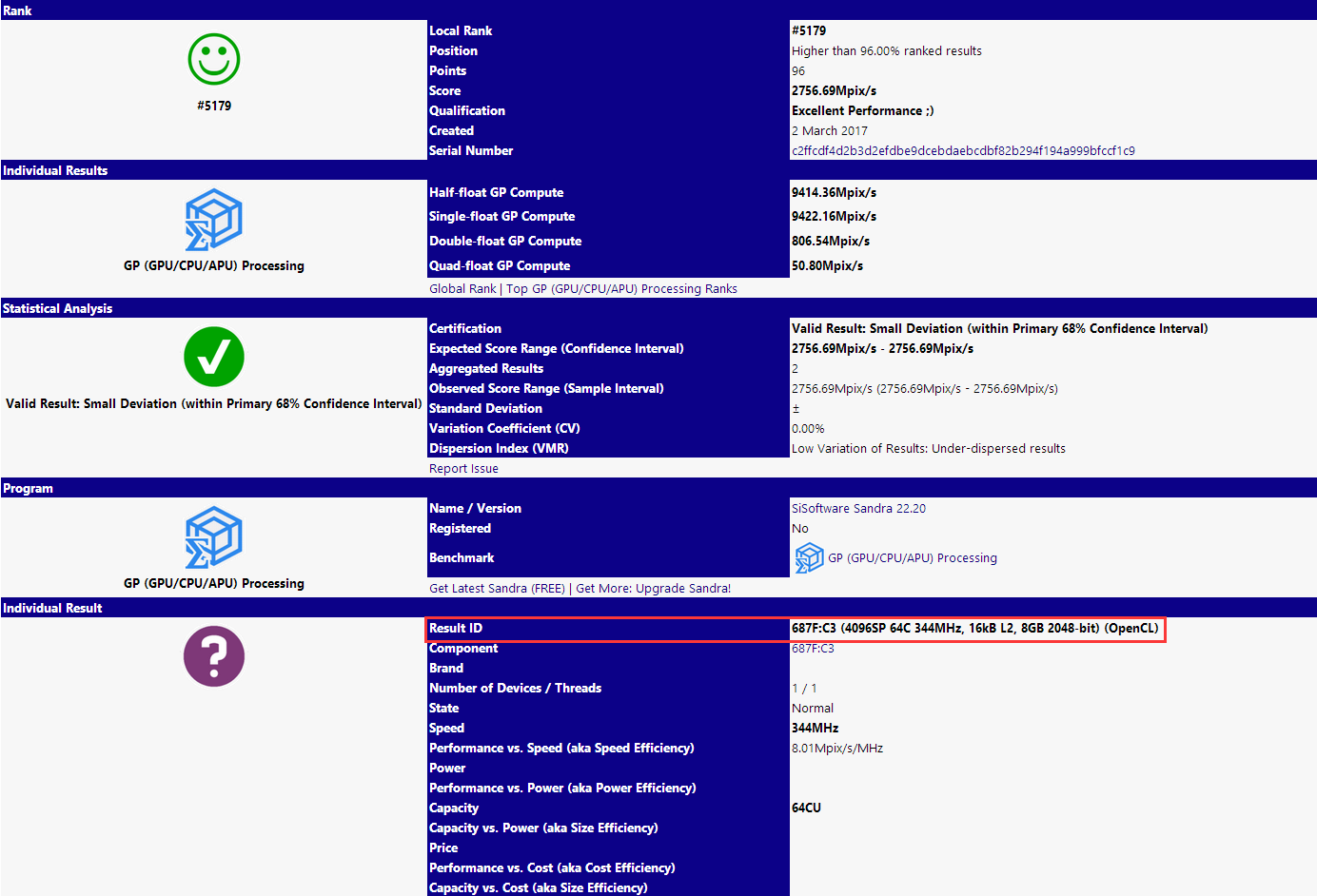 Sisoftware数据库里就出现了“687F:C3”,显示有64个计算单元、4096个流处理器,2048-bit 8GB显存——344MHz的核心频率是待机状态。