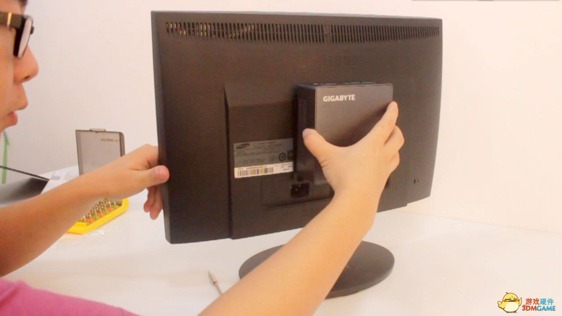 技嘉Brix可以挂在显示器后背,对比19吋液晶显示器,绝对的巴掌大小!
