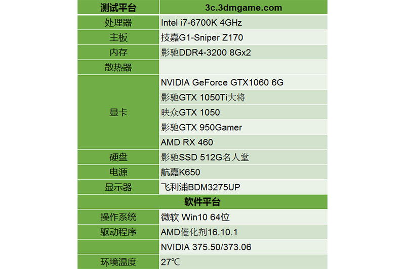 在驱动方面笔者要说明一下,我们这次拿到的是NVIDIA测试版本驱动375.50,在GTX 1050/1050Ti以外的N卡测试使用373.06版本驱动。A卡则使用了16.10.1版本驱动。另外本次测试主要对比的是GTX 1050以及GTX 1050Ti对比自家上代显卡以及AMD同级别显卡的区别,加入GTX 1060 6G只是为了作为一个参考,并不参加对比测试。
