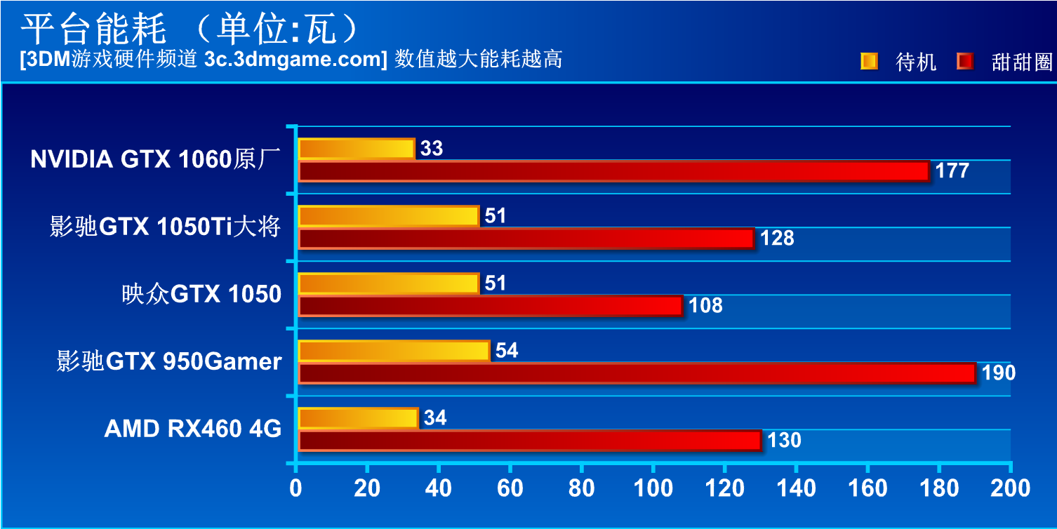 这次测试我们可以看到在待机情况下GTX 1060 6G表现最为出色,作为这几张卡中性能最高的一个待机功耗也能保持到最低,反观GTX 1050和GTX 1050Ti,虽然相比上代GTX 950待机功耗稍低,但也谈不上十分出色,和GTX 1050同级的RX 460则能保证较高的水准。