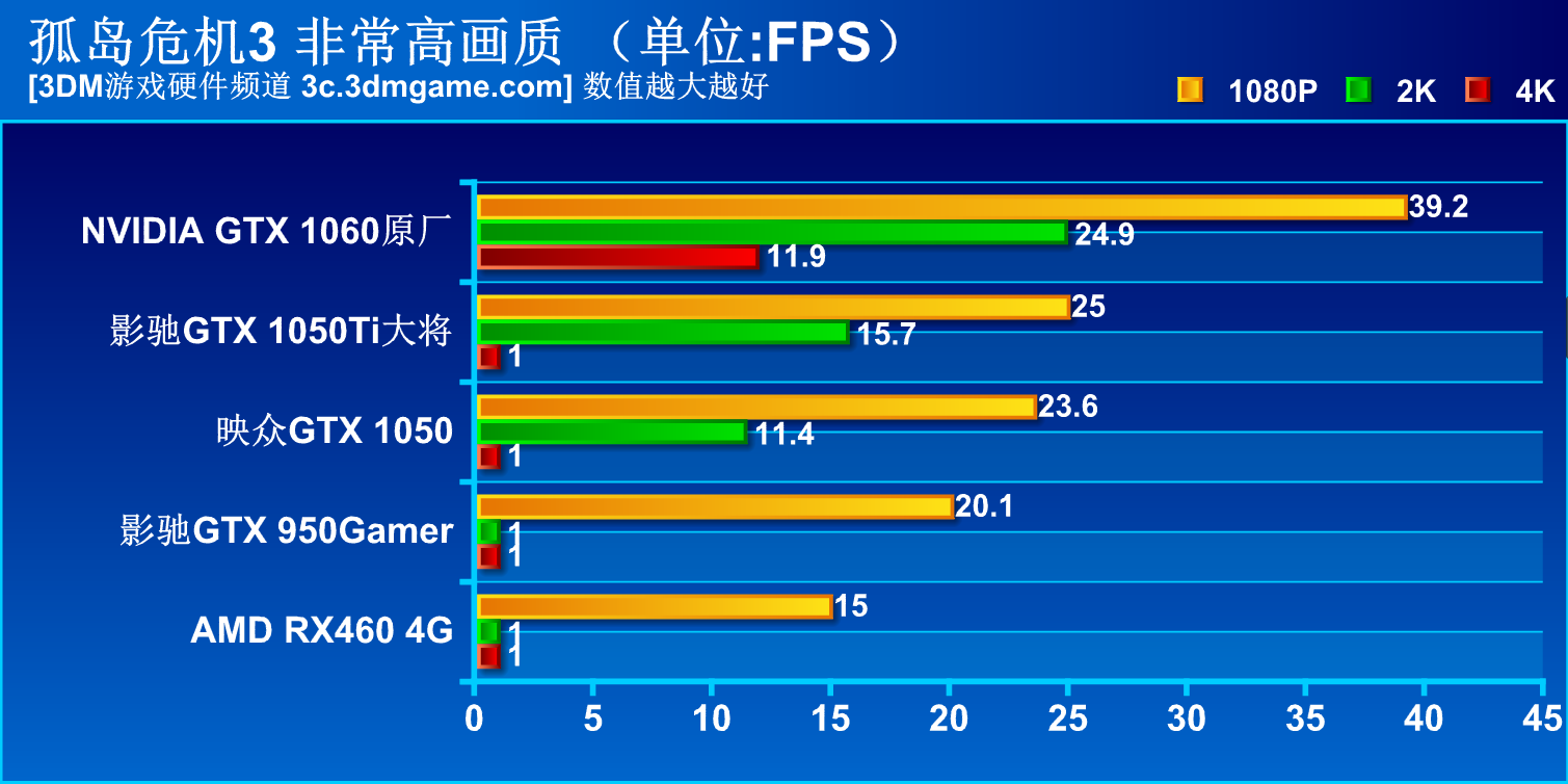由于GTX 1050Ti和GTX 1050均定位于1080P分辨率,所以这项测试我们主要看一下1080P分辨率的表现,2K和4K仅作为极限负载的参考。