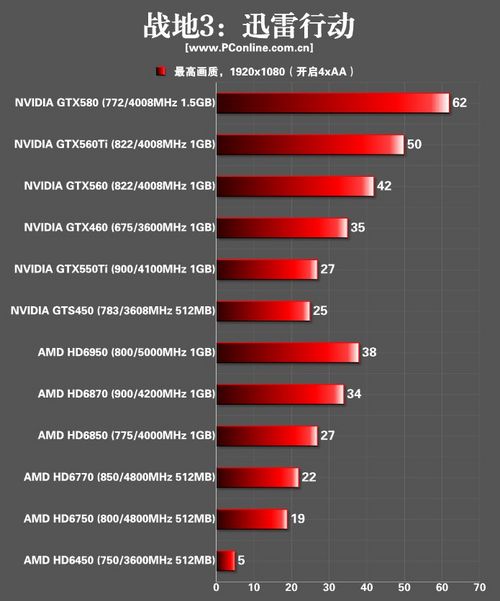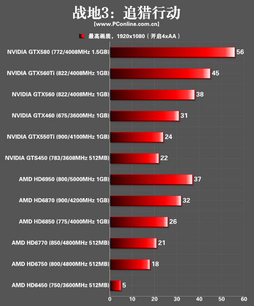 如果以30fps帧速作为流畅标准的话,在这款游戏中,GTX460、HD6870级别显卡才可以在1080P分辨率、最高画质下达到流畅级别,可见《战地3》对显卡要求的确非同一般,千元以内的显卡基本上全部倒下了。另外,在《战地3》游戏中,同定位N卡执行效率显著比A卡高出一截,HD6950性能表现只是与GTX560大概持平,看来《战地3》游戏对A卡支持不太理想。