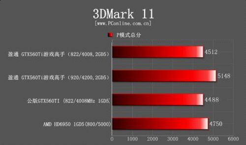 在3DMark11测试中,盈通GTX560Ti-2048GD5游戏高手显卡凭借着出色的性能取得了不错的成绩:在低频下性能不算很抢眼,但在高频时大幅领先AMD HD6950、公版GTX560Ti,得分突破5100分。>>