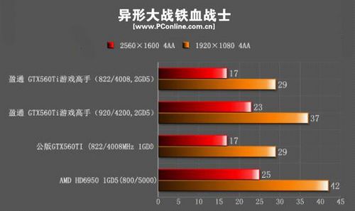 在《异形大战铁血战士》测试中,可以看到高频时盈通 GTX560Ti 游戏高手显卡表现较为抢眼,对比GTX560Ti拥有较大的领先优势,而在1920x1080 4AA的环境下,高低频的盈通GTX560Ti游戏高手帧数都达到30帧以上,并且两者的在测试中表现都非常流畅。