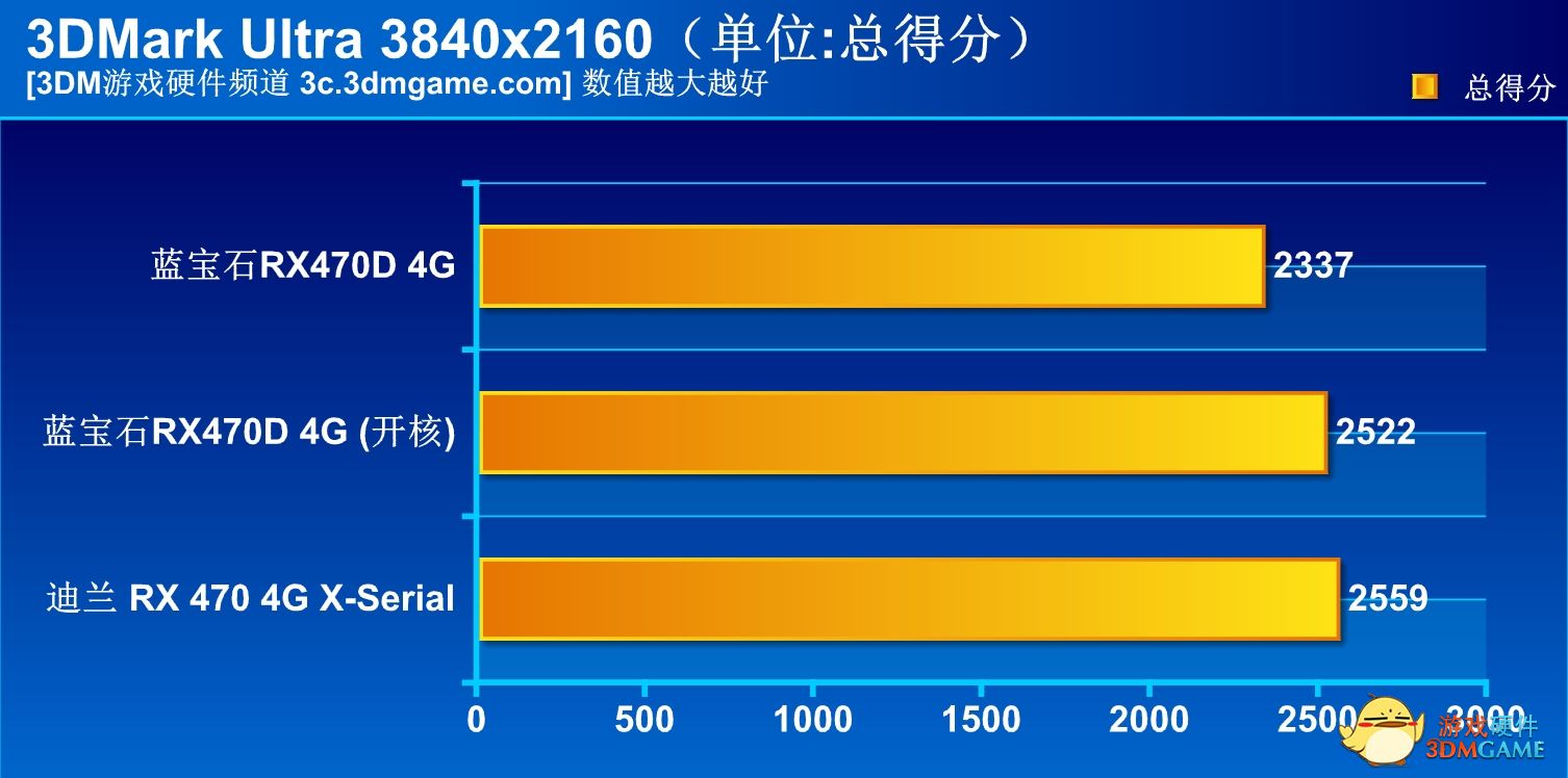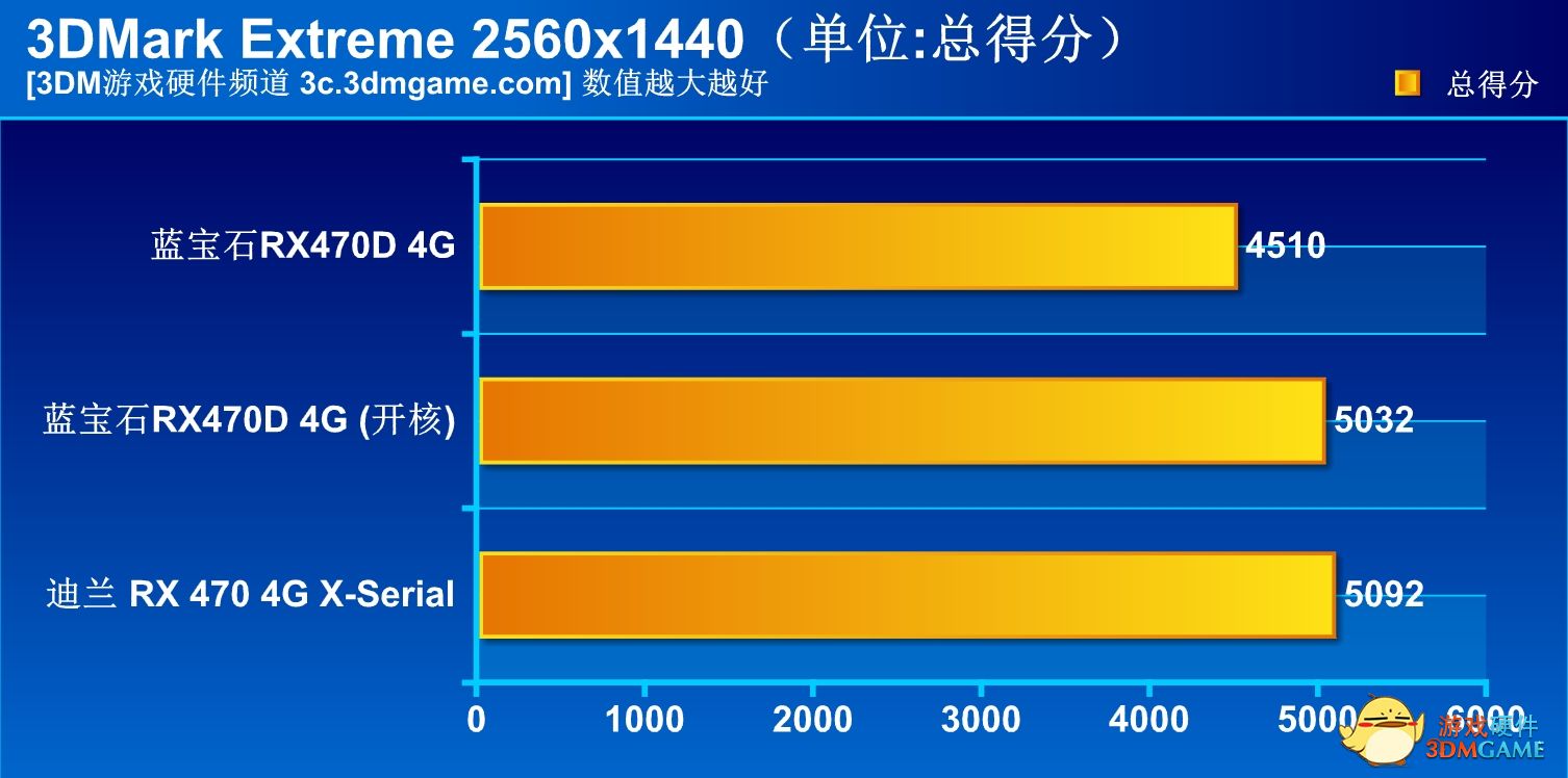 在Extreme 2K和Ultra 4K分辨率的3DMark测试中我们可以清楚的看到RX470D、开核470D和普通RX470的性能对比!可以看出,开核之后的RX470D显卡相比没有开核之前的性能有了小幅度提升,基本与RX470的水平持平,100分以内属于测试的误差,两者的性能几乎是一样的!