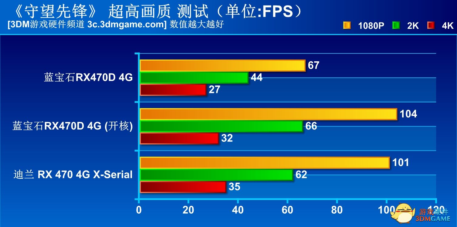 从游戏测试中我们可以看出开核后的RX470D对网络游戏游戏的性能提升不只是一点点,首先在1080P分辨率下可以达到100FPS以上的高帧率,这是非常不错的情况!刚开始郭少还以为是测试异常导致了RX470D帧数过低,但是经过验证发现并不是,可能是因为驱动的原因导致了未开核的RX470D对守望先锋游戏的优化不到位!