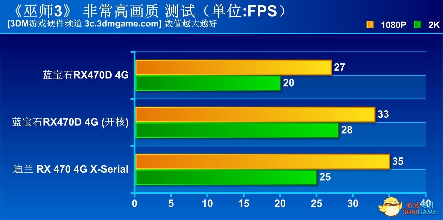 同样的情况也出现在了巫师3这一款游戏的1080P分辨率上,如果是未开核的RX470D是没有办法在全高特效下流畅运行该款游戏的,但是开了核可以达到平均33FPS的水平,作为这个价位的显卡来说已经是超性价比了!