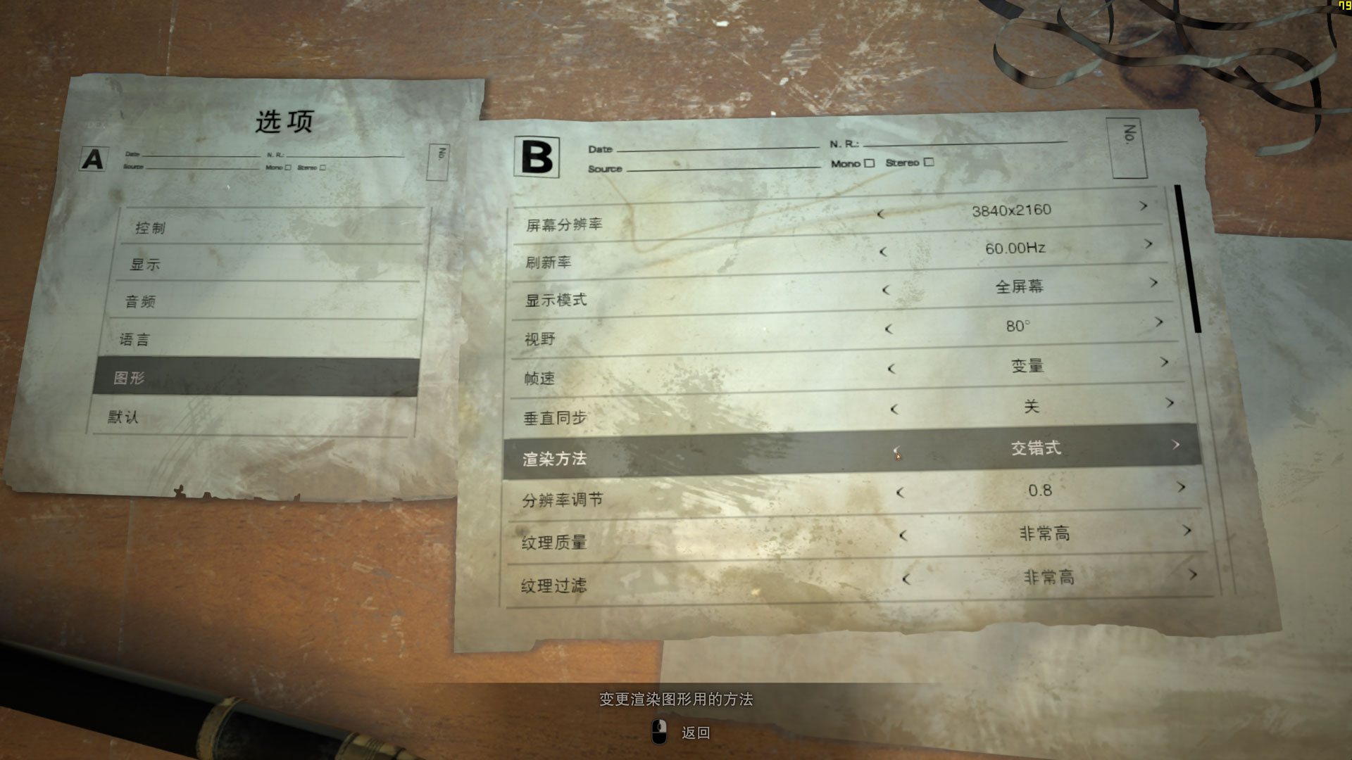 在刚打开画面设置菜单时笔者发现游戏字体十分模糊,在确定分辨率没有错误后笔者相信肯定是画面设置的一个项目导致了这个问题,结果在渲染部分找到了答案:在使用交错渲染时字体会模糊,而使用正常渲染则字体正常。