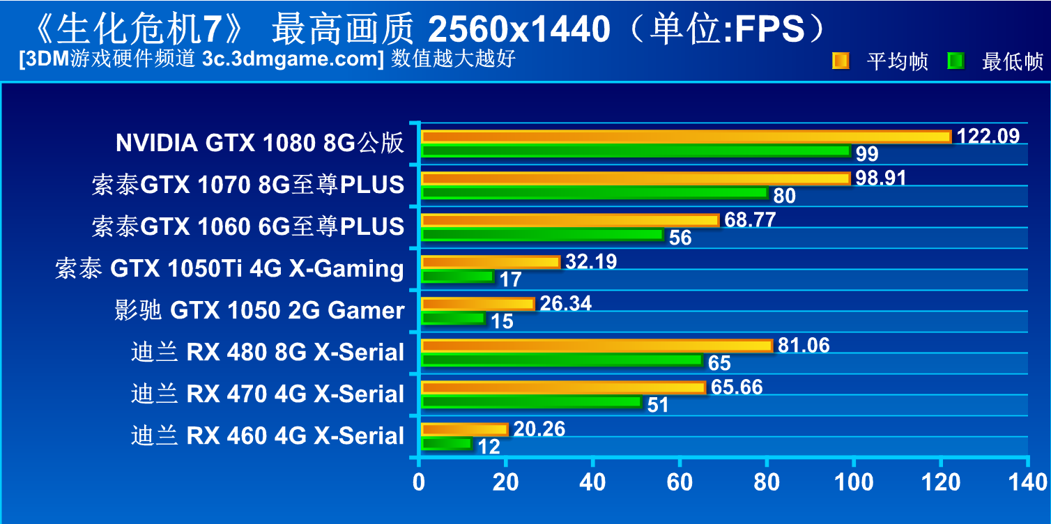 再来看A卡部分,RX 480依旧以81帧的成绩大幅度领先GTX 1060,而RX 470也更进一步拉近了与GTX 1060的成绩差距,看来假以时日有着AMD鸡血驱动加持的RX 470也没准就真的超越了GTX 1060。至于RX 460以及GTX 1050Ti/1050由于产品定位并不适合在超过1080P分辨率进行游戏。