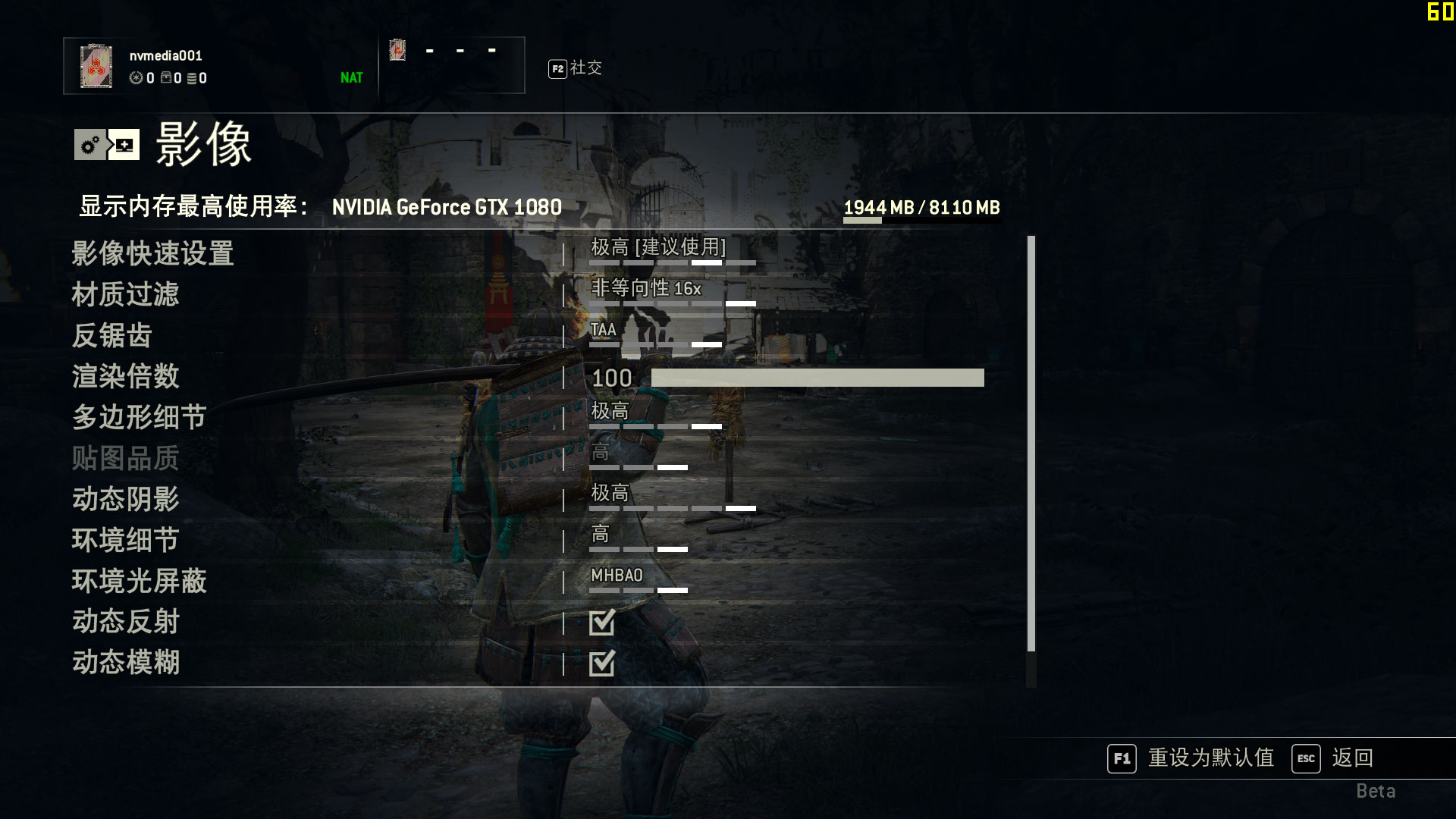 画面设置部分,游戏没有给我们太多多余的选项,在接下来的测试中笔者使用默认极高画面(TAA+MHBAO)设置并关闭垂直同步,使用1080P、2K、4K三种分辨率进行测试。