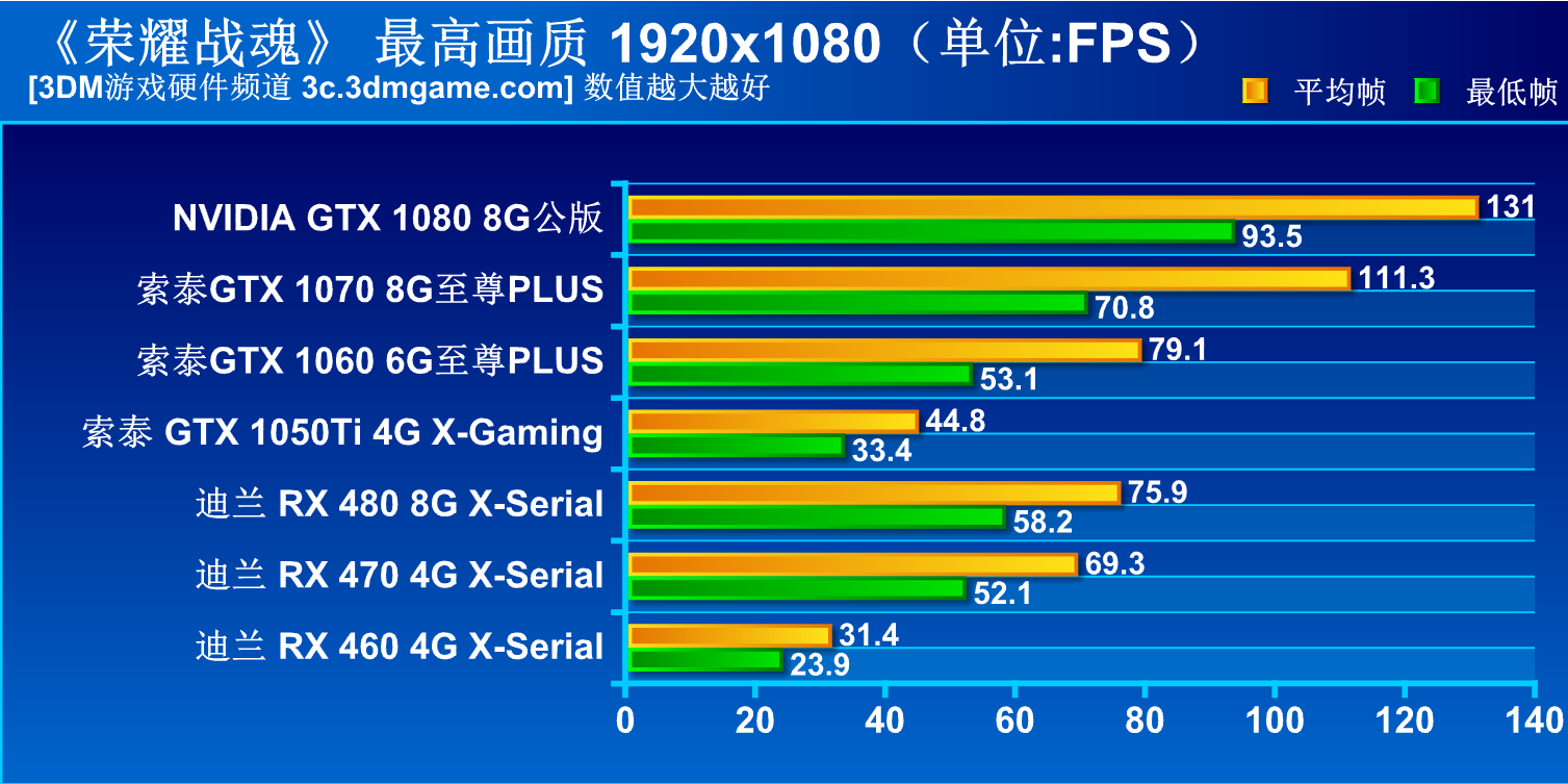 在最主流的1080P分辨率下,位于第一梯队的当属旗舰级的GTX 1080,131帧的平均成绩大幅度领先其他所有显卡。而GTX 1070也突破了百帧,经过这么多款游戏的历练,GTX 1070也都顺利完成了挑战,证明这款显卡还是能拿下当前所有主流游戏的。