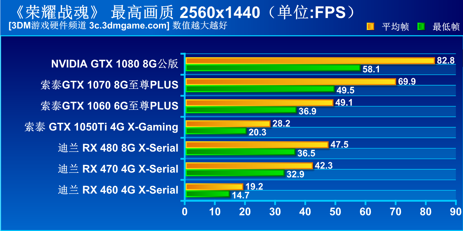 到了更高的分辨率GTX 1060和RX 480依然难解难分,两张卡的帧数相差越来越小并且都达到了40帧的基本标准,当然为了游戏体验来说最好还是降低特效达到60帧为好。除上面几张卡以外,RX 470也达到了40帧以上的水平,并且和RX 480的差距并没有很大,说明这张卡也是有足够的实力来挑战2K分辨率。