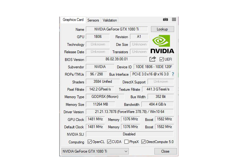 可以看到虽然GPU-Z还没有完全识别GTX 1080Ti,但大多数参数也已经能看到了,根据官方披露参数,GTX 1080Ti基础频率为1480MHz,boost频率为1582Mhz。