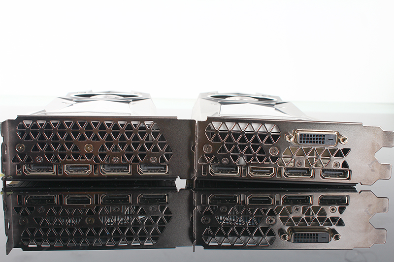 接口对比,GTX 1080Ti减少了DVI接口,不过也相应的增大了出风口。