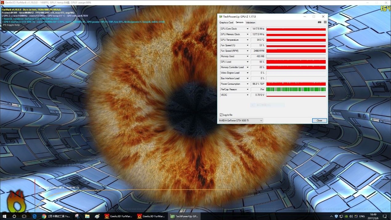 在温度测试环节,笔者使用烤机常用软件FurMark V1.18版本并打开GPU-Z进行记录,通过图中可以看到经过十分钟的烤机后显卡温度已经稳定在了85度,而这个温度也和当初GTX 1080首发测试时的温度一致,这也说明在显卡散热设计上GTX 1080Ti是沿用了GTX 1080的一样的设计。
