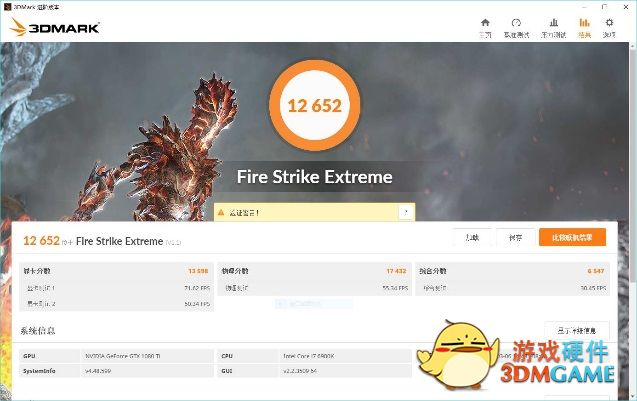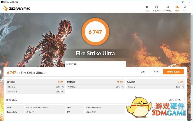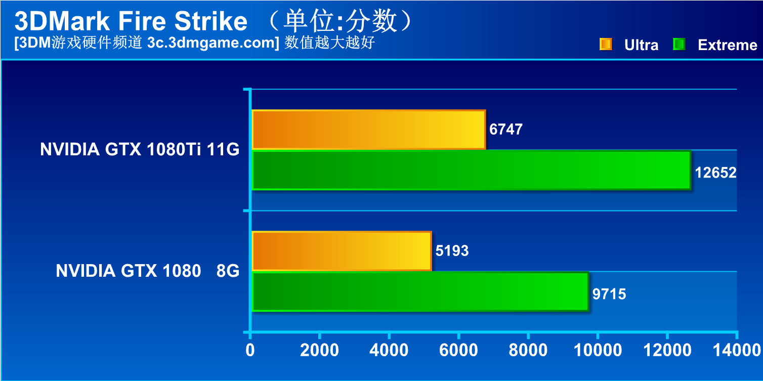 在3DMark Fire Strike Extreme测试中 GTX 1080Ti得到了12652的总分,其中显卡分数为13598,使用同平台的情况下相比GTX 1080有着30.2%的提升,而在3DMark Fire Strike Ultra测试中,GTX 1080Ti依旧得到了6747分,相比GTX 1080有29.9%的提升,基本符合我们对于30%提升的预估。