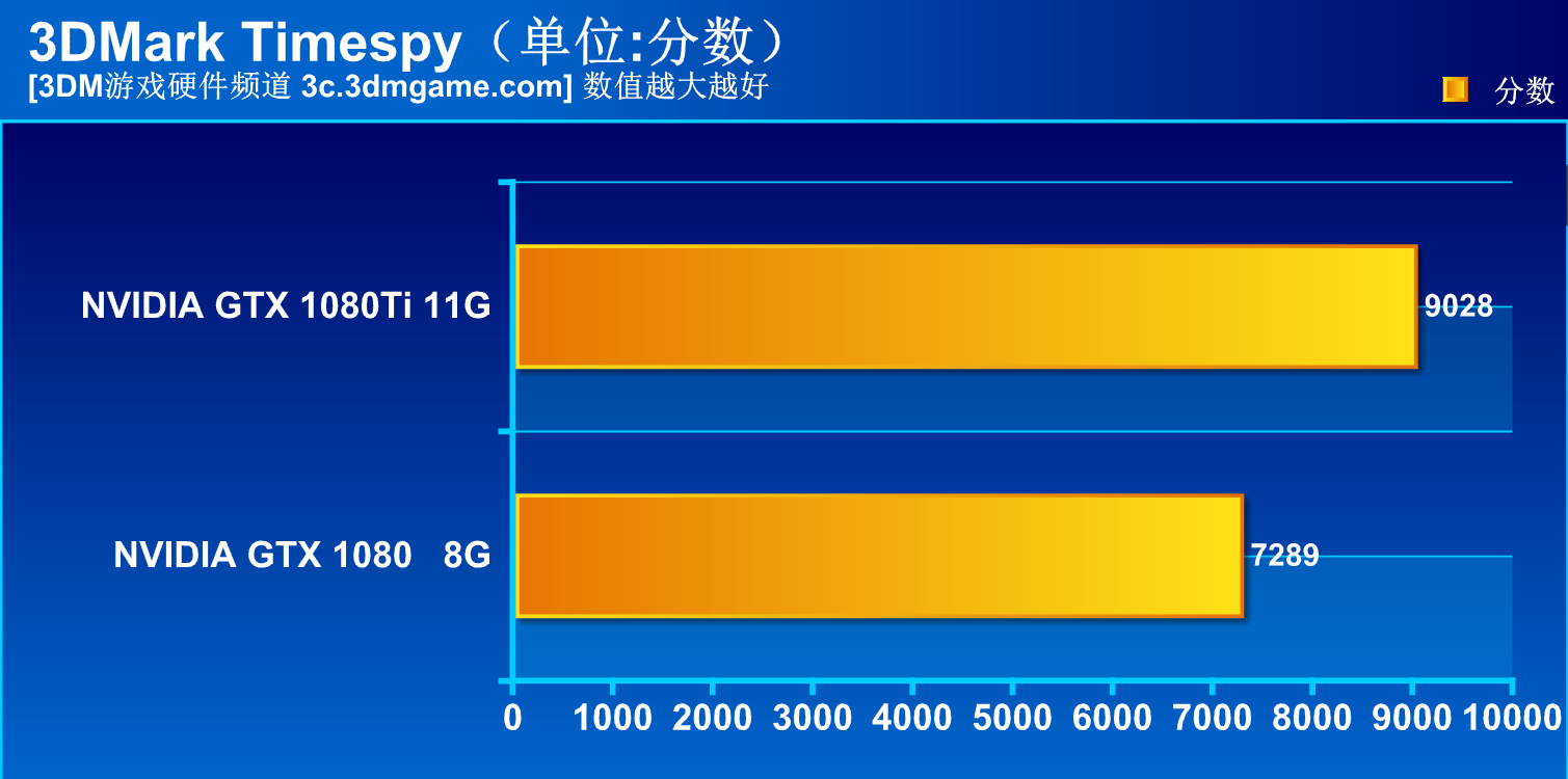 3DMark Timespy是专门针对DX12 API进行测试的测试组件,在这项测试中GTX 1080Ti跑出了9028分的惊人成绩,就单卡跑分来看,除去液氮极限超频的显卡,目前几乎找不到能企及这个分数的显卡,相比GTX 1080而言有着23.7%的提升.