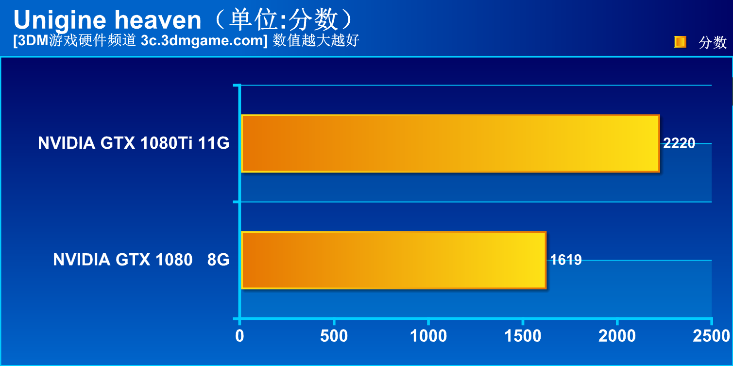 Unigine heaven是俄罗斯开发商Unigine为自家开发的游戏引擎Unigine Engine所制作的电脑性能测试软件,主要针对DX11来测试电脑在极端条件下的性能,其结果也以具体分数的形式表现出来,从结果中我们能看到GTX 1080Ti相对GTX 1080提升比DX12要明显的多,两者差距足足有37%之多,结合Timespy的成绩也能从侧面说明GTX 1080Ti在游戏中的发挥会有多好。