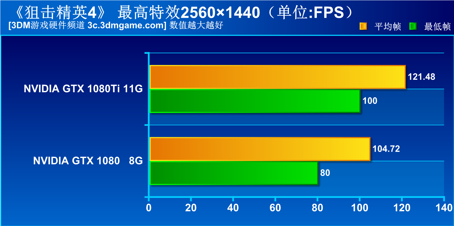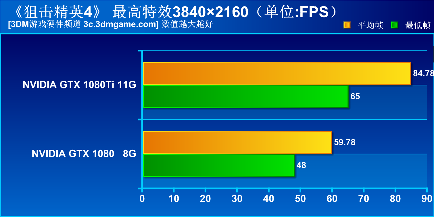 在《狙击精英4》测试中,4K分辨率下GTX 1080Ti依然有着84帧的成绩,而不同分辨率下GTX 1080Ti的最低帧也基本持平GTX 1080的平均帧水平,而在4K分辨率下GTX 1080相比GTX 1080Ti足足有45%的性能差距,这比我们预估的30%差别还要大很多。