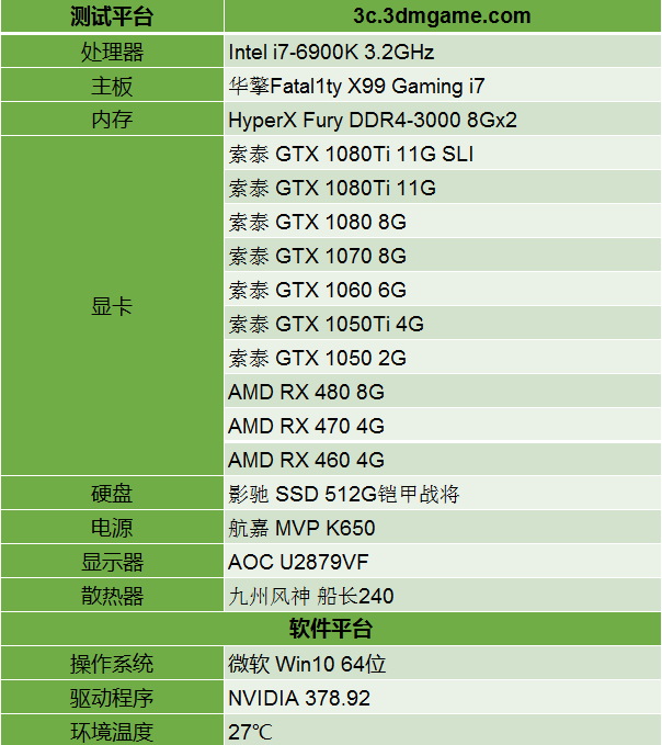 笔者主要针对1080P、2K、4K三种不同分辨率进行测试,而显卡部分笔者也选择了NVIDIA 10系显卡及AMD RX 400系列显卡参与测试,具体配置如下: