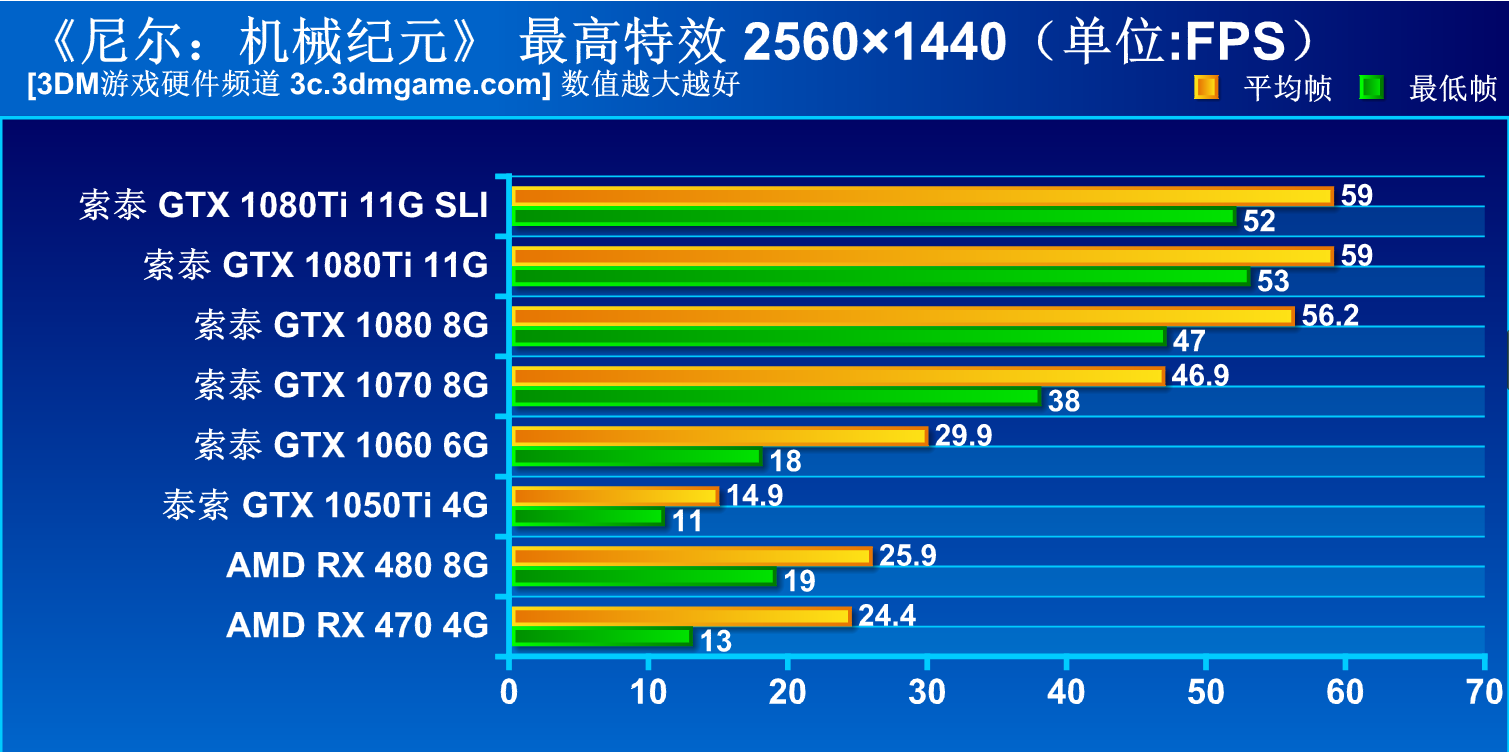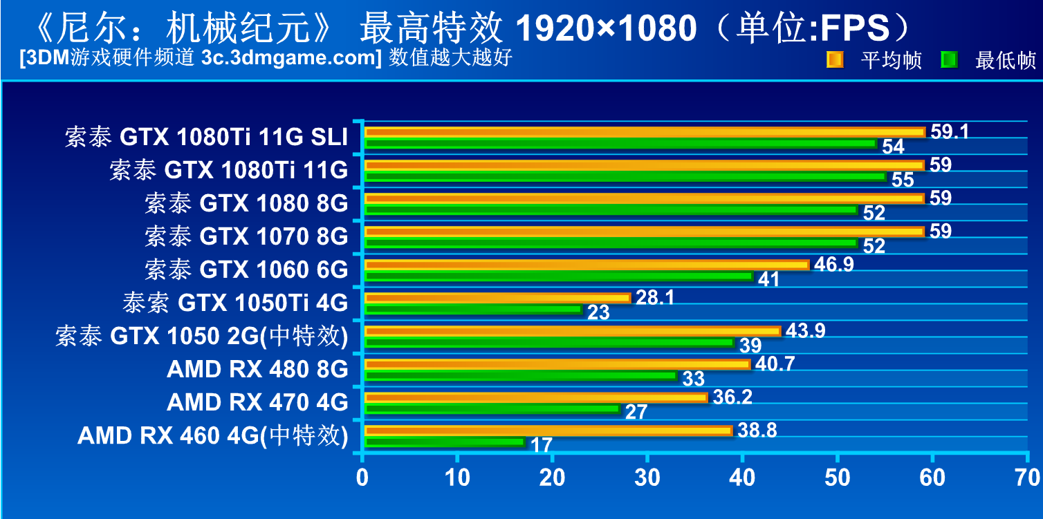 在1080P分辨率下由于游戏锁帧,所以我们并不能看出游戏对SLI支持情况如何,而在高特效下玩家想要达到满帧至少需要一张GTX 1070。