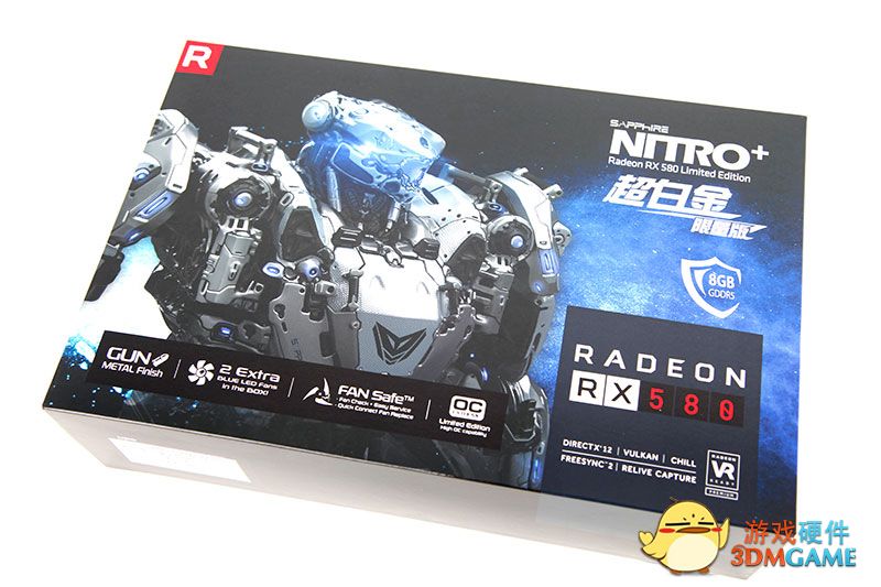 蓝宝RX580 8G NITRO超白金限量版显卡,以蓝色为主基调,正面是一个帅气的机器人!