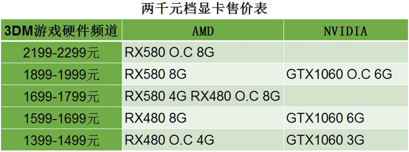 然后我们从当前掌握的信息对两千元档售价的显卡来一波实力分析。首先新显卡刚上市的价格一般都是比较高的,所以说RX580超频版的显卡AMD这边给的零售价是2199-2299元,虽然超频版的GTX1060显卡在上市之初也是这么贵的,但是经过了几个月的销售,开车价已经到了不到1999元!但是鉴于RX580同价位的显卡为8GB显存,而GTX1060显卡为6GB显存,两方是不分伯仲。如果预算紧张但是想要大显存的朋友不妨考虑RX480 8G显卡,开车价已经和普通版GTX1060差不多不到1699元,还是非常具有性价比的!