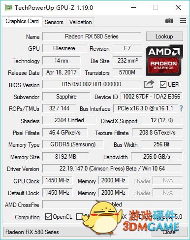 可以看到这一块蓝宝NITRO RX580 8G版显卡的核心频率为1450MHz,和官方公布的频率一对比发现是一张鸡血版的显卡,显存频率为2000MHz。采用了三星的GDDR5显存,容量为8GB,让我们进入性能测试环节看看这块显卡的性能到底如何!