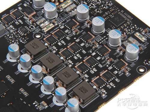 显卡配置4+1相供电,核心4相,显存1相,每相供电配置日化高品质固态电容、R30铁素体电感和低通内阻MOSFET等用料奢华,视觉感受上十分养眼,为高频的运行提供了稳定的保障。