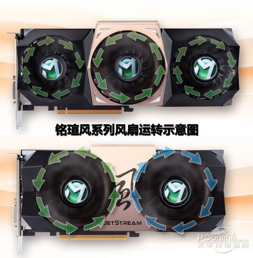 铭瑄GTX680 JetStream采用高端卡常用的三风扇散热设计,以黑色为主调,给人不一样的感觉。并采用X3智能风扇系统,搭载三风扇的设计,以8*9*8cm风扇的规格排列,并采用涡轮增压扇叶,特殊造型的扇叶还能减少风扇转动时的切风声,噪音表现比普通风扇更优异。