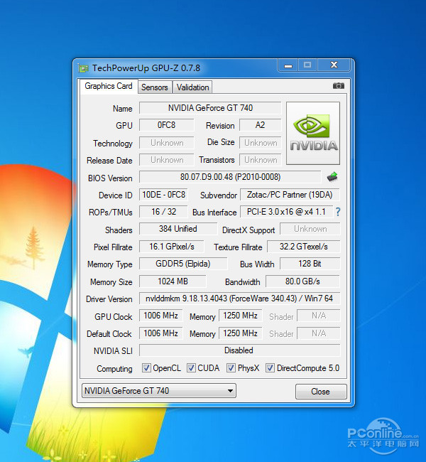 测试平台说明:在测试平台方面我们选用了消费级高端平台4770K+Z97,确保在测试的过程中不会造成数据瓶颈的情况发生,为了增加对比性,我们还增加公版的GT740、GTX650和AMD R7 250进行比较,看看索泰 GT740-1GD5 雷霆TSI PA的性能表现如何。