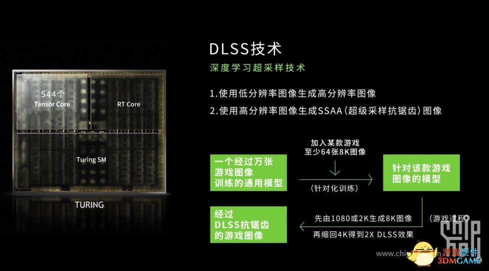 这技术主要是涉及RTX图灵显卡中的Tensor Core(张量核心),这颗核心本质上就是一个AI单元,NVIDIA利用AI单元去完成深度学习超采样的抗锯齿,像一张残缺不堪的照片就通过这样的运算进行完美复原。