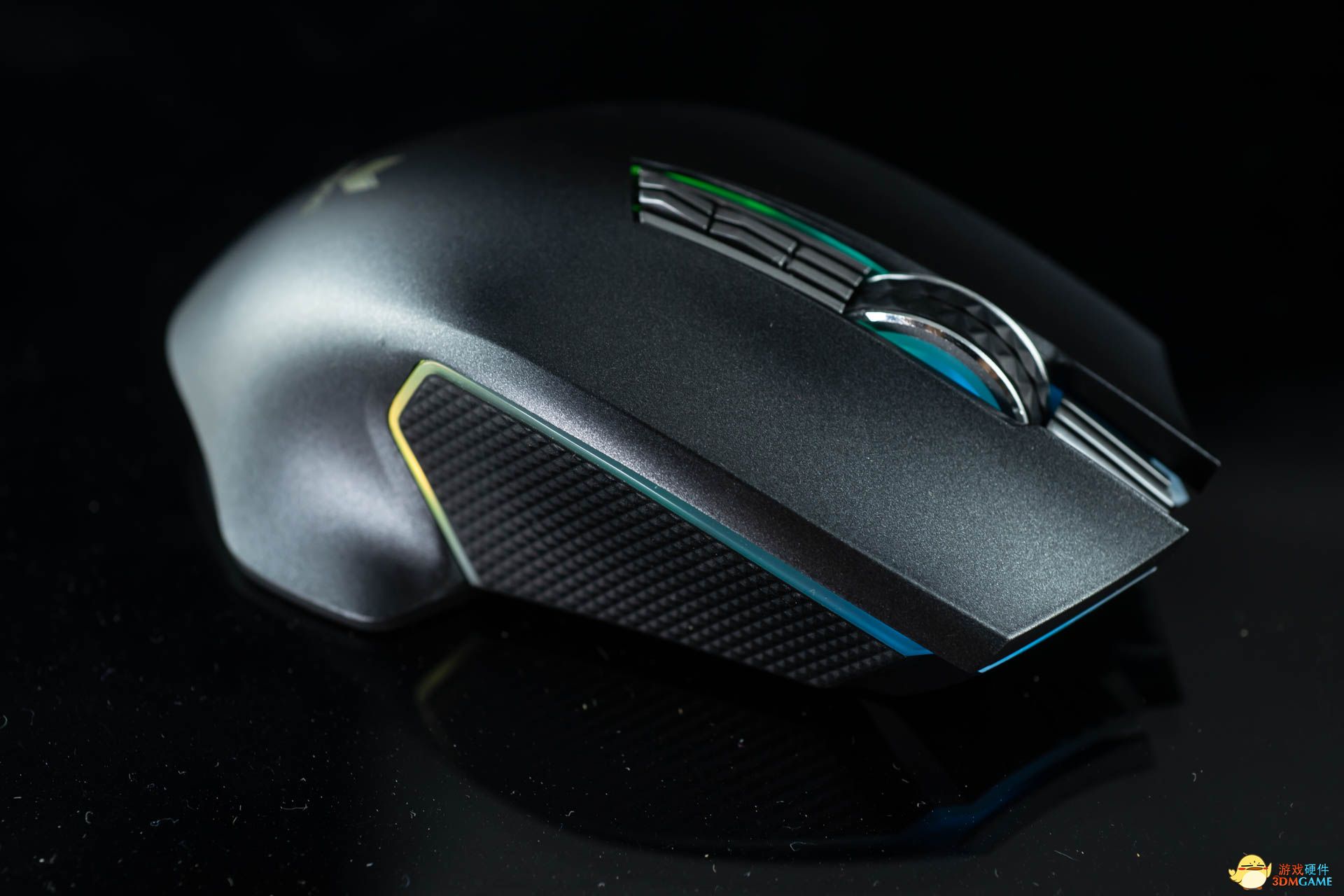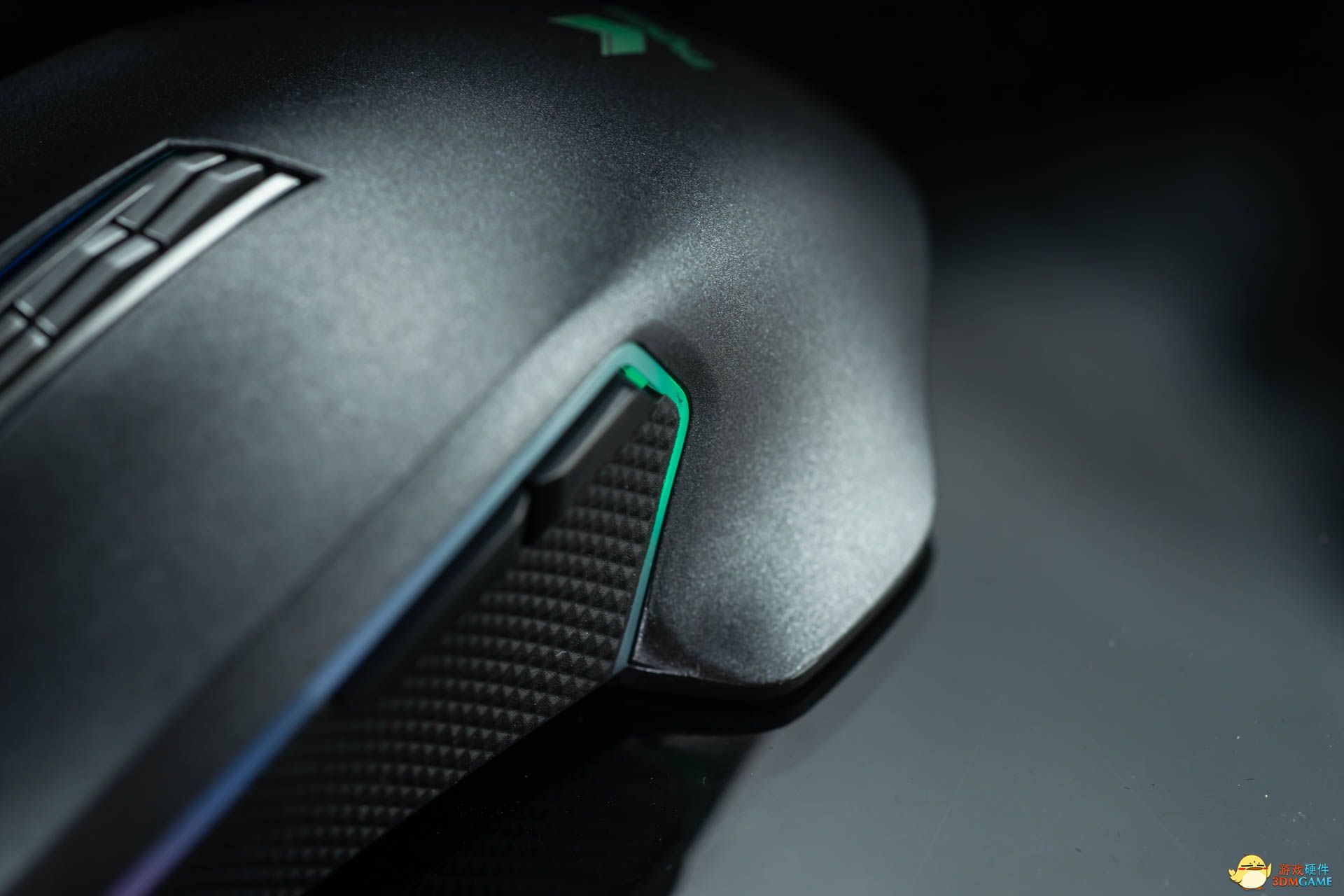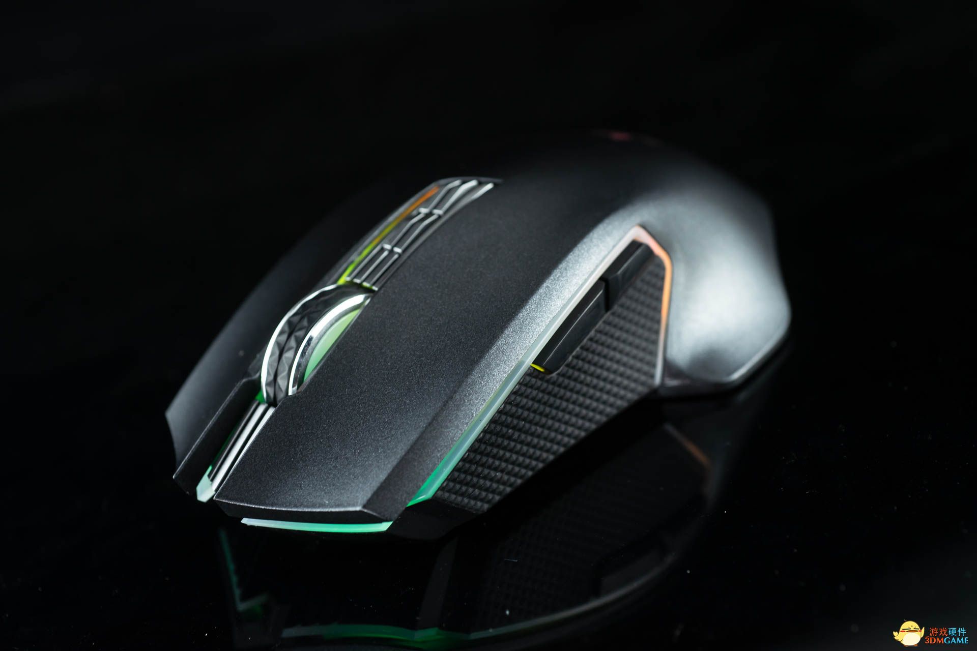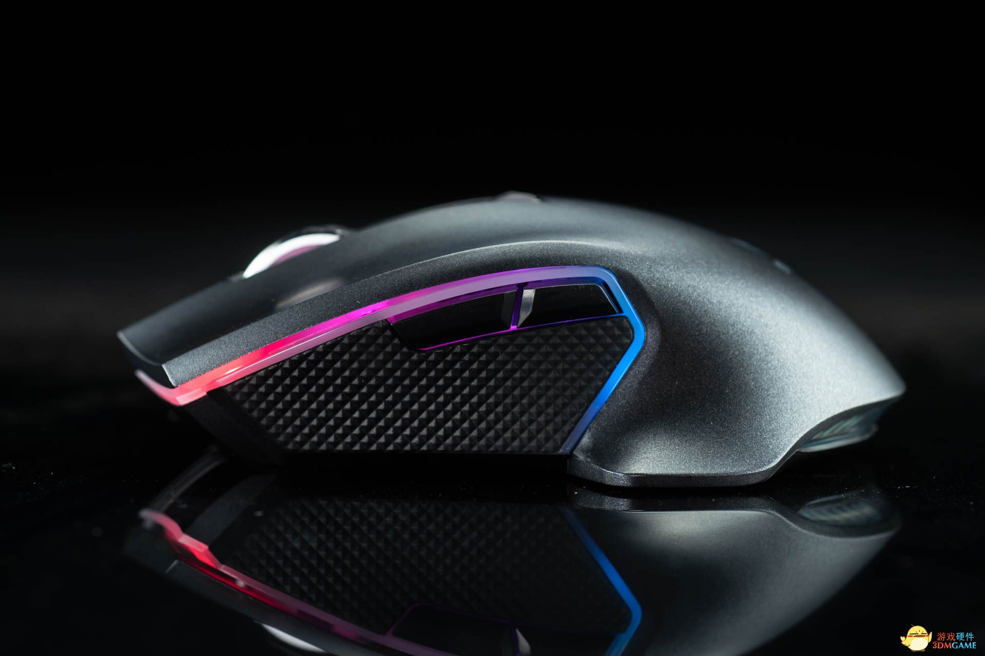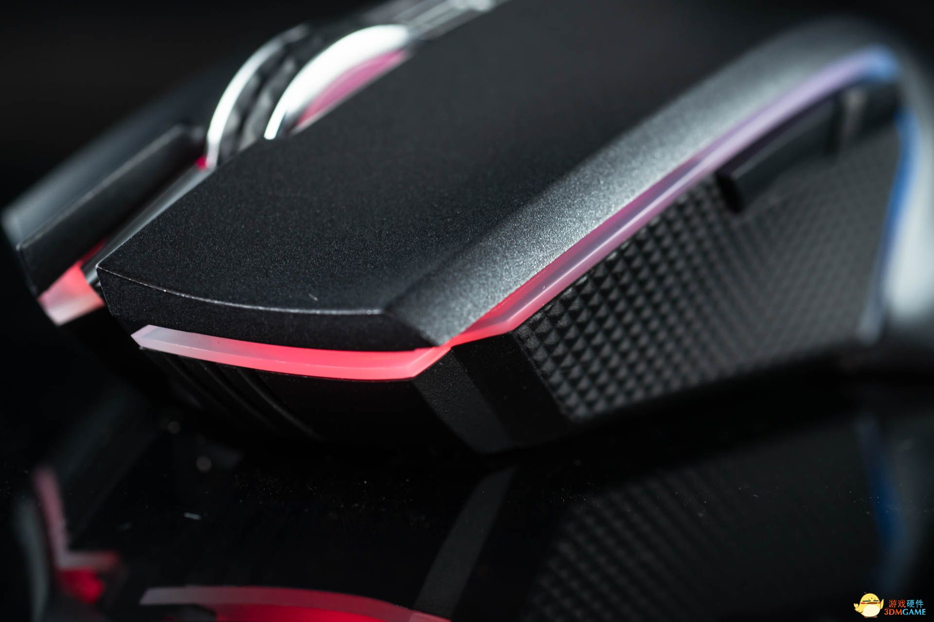 鼠标在滚轮部分、侧面、后部的Logo区域以及尾部都安装有RGB装饰灯。其中一条贯穿鼠标前脸和侧面的装饰灯条格外提神。灯光的亮度饱和度以及色彩的均匀程度表现还算不错,配合上驱动软件之后,还有更多的颜色和灯光模式可选。