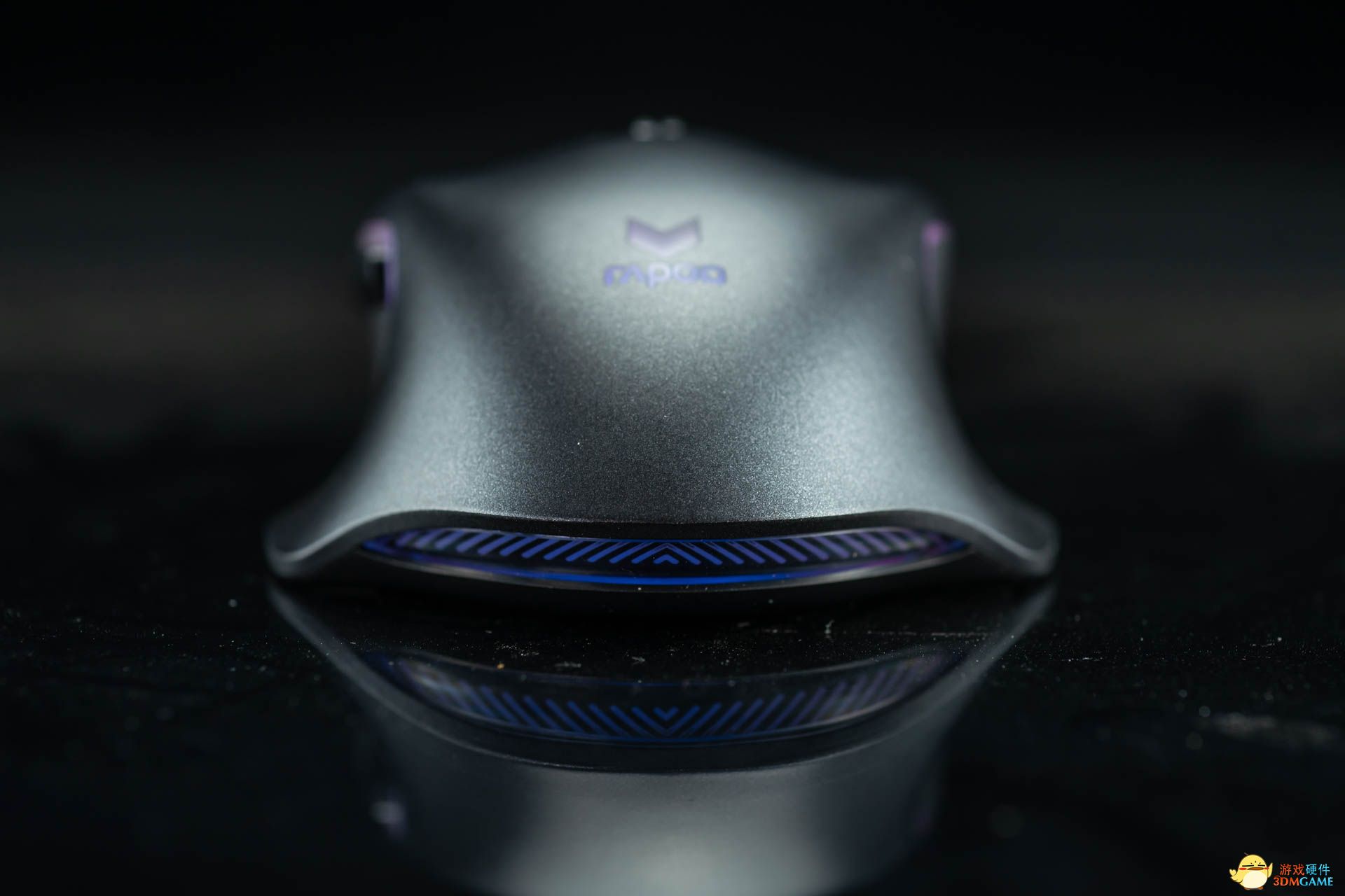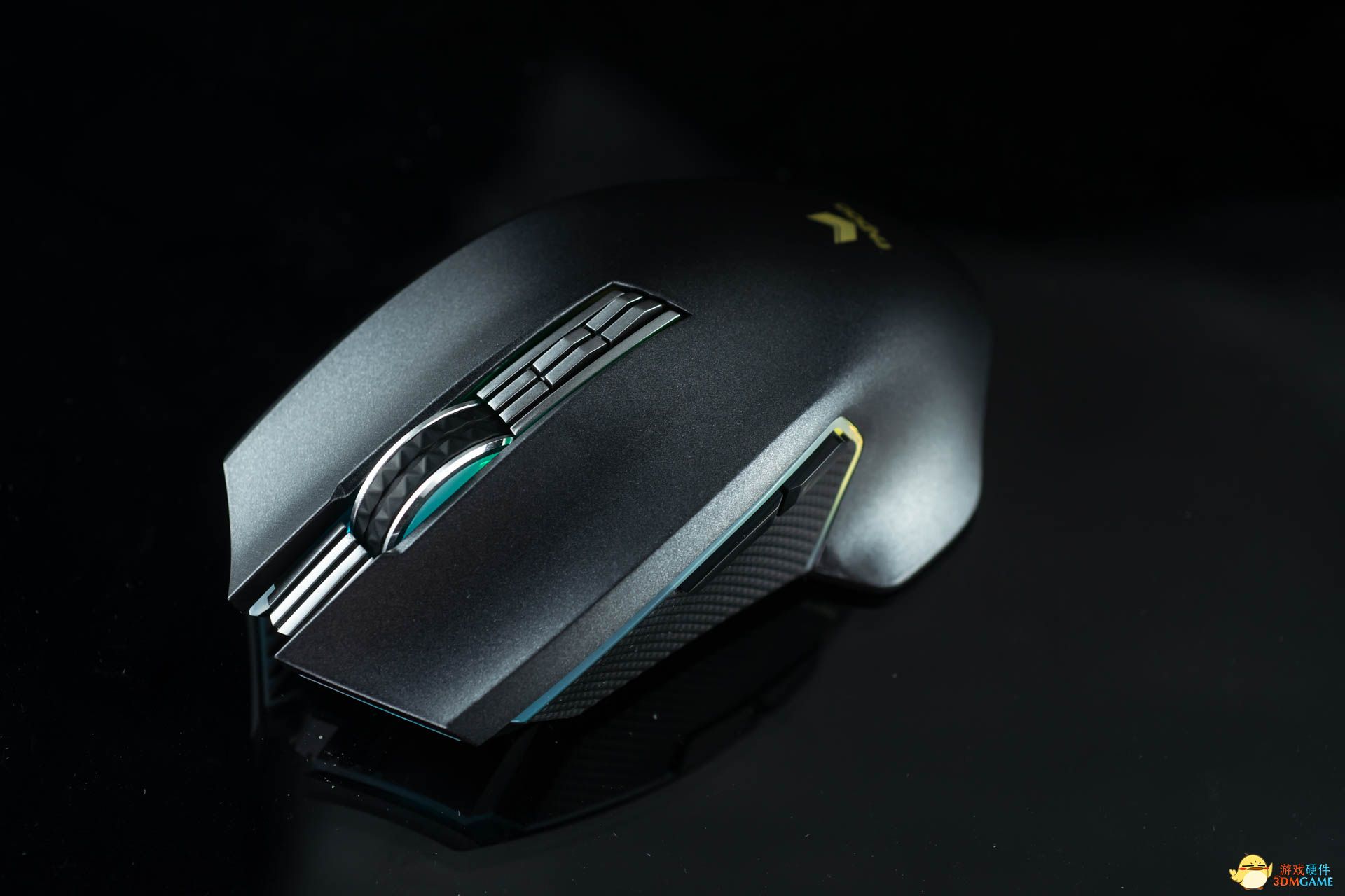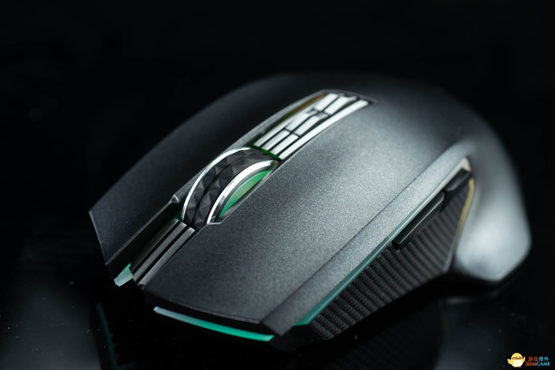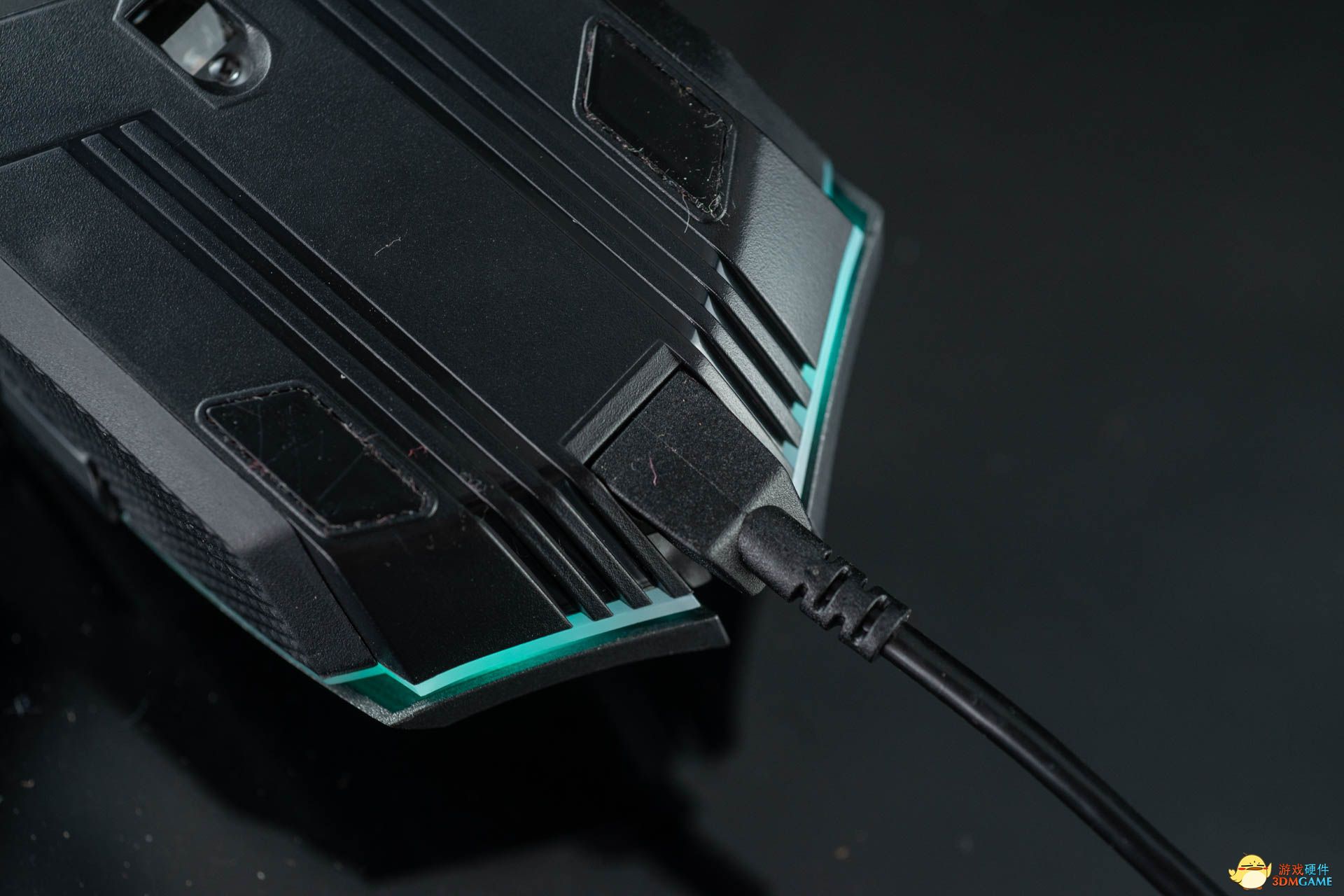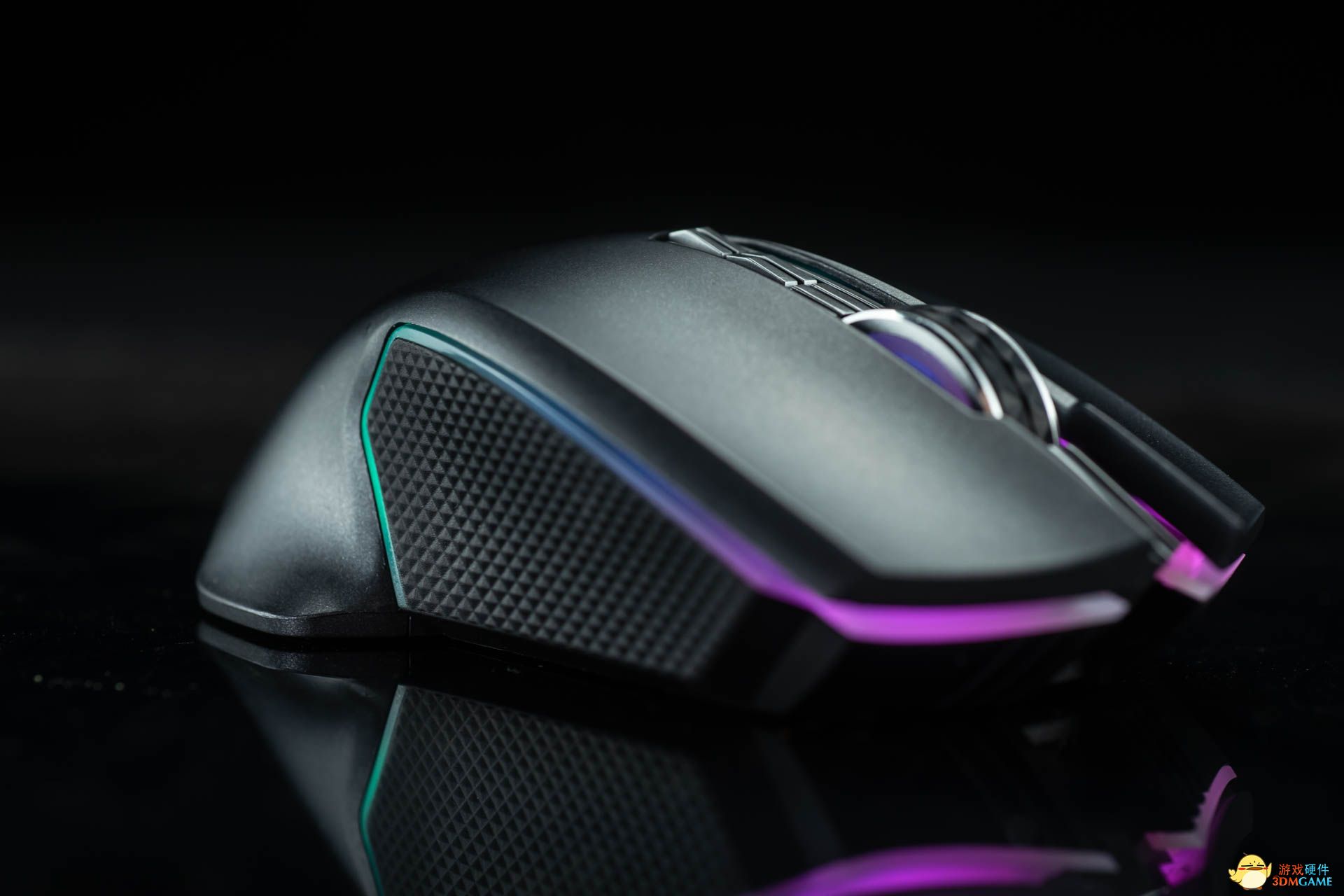 鼠标在滚轮部分、侧面、后部的Logo区域以及尾部都安装有RGB装饰灯。其中一条贯穿鼠标前脸和侧面的装饰灯条格外提神。灯光的亮度饱和度以及色彩的均匀程度表现还算不错,配合上驱动软件之后,还有更多的颜色和灯光模式可选。