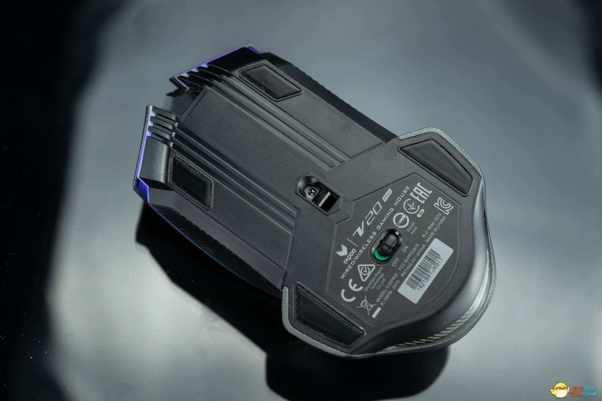 两颗主键采用了与机身背板一体的设计,但在手感上仍然比较清晰。雷柏V20PRO双模版采用的是2000万次寿命的微动开关,开关反馈非常的清脆。底部脚垫面积不大,但平均分布在鼠标的四个角落,提供了一个非常稳健的手感。