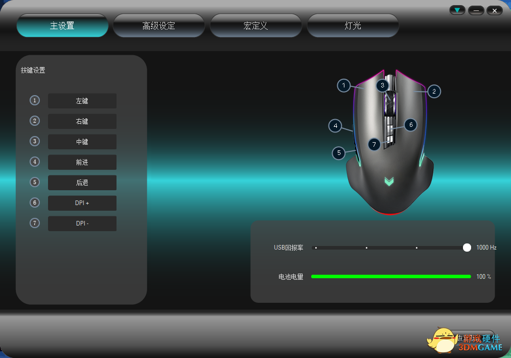 驱动部分,雷柏V20PRO使用了一套全新的驱动软件,比起雷柏自家原来的驱动,界面更为简洁直观。驱动中可以看到电池的剩余电量,在首页也可以调整鼠标上多个按键的功能以及回报率。