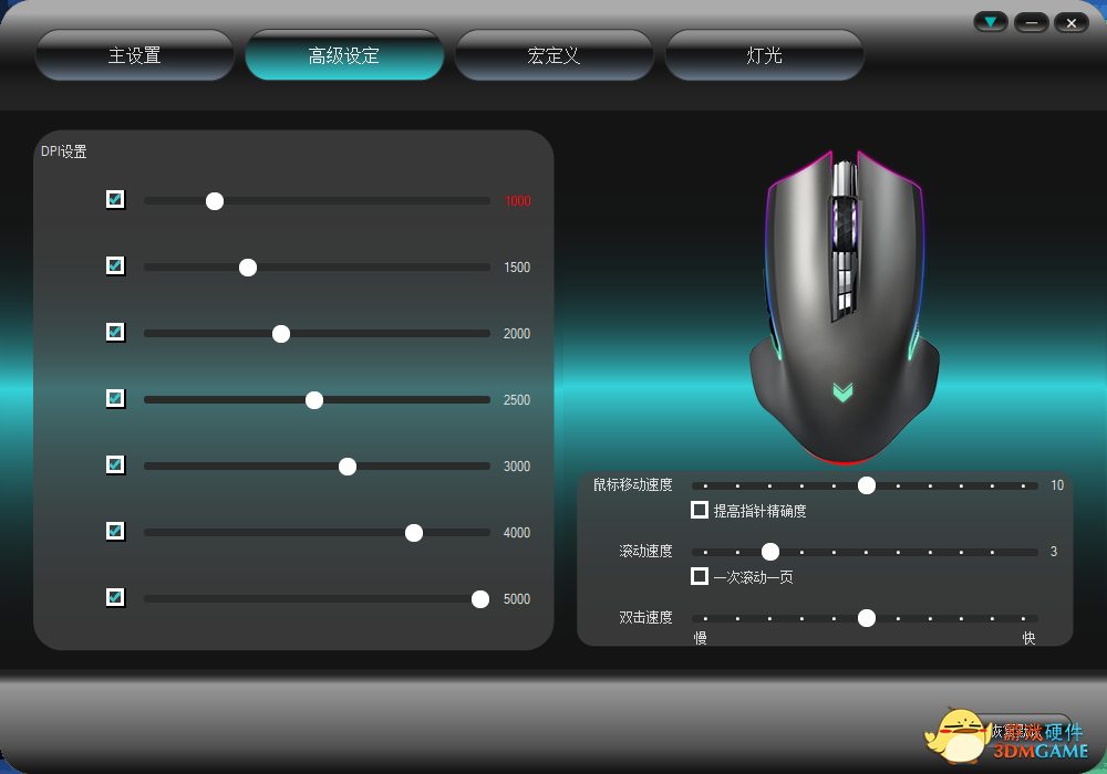 鼠标板载内存支持存储七组不同的DPI参数,可以通过滚轮后方的按键以100DPI步进为单位调整。而对于很多高端FPS玩家非常重要的“提高指针速度”功能也可以根据自己的使用需求酌情关闭。