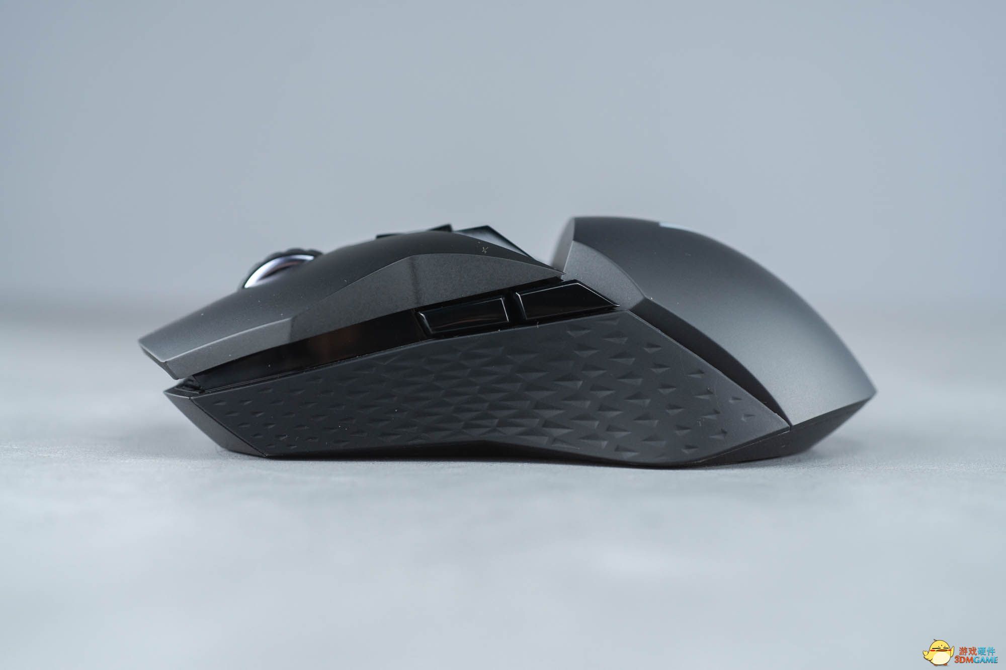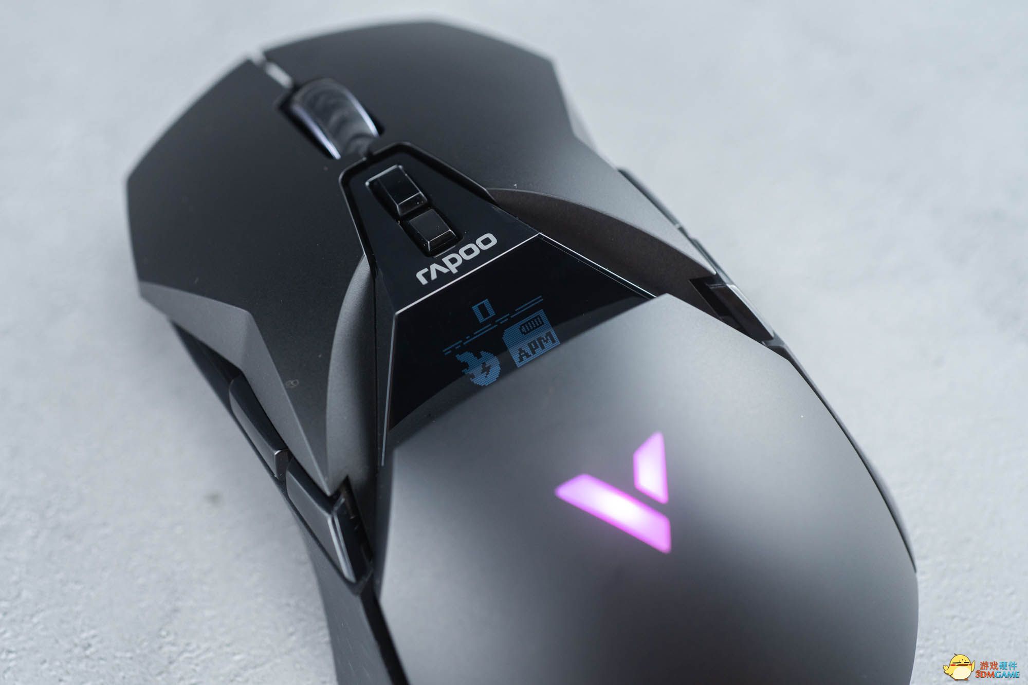 作为自家的旗舰产品,雷柏VT950Q的整体做工非常扎实,两颗宽大的主键尽管面积非常大,但没有任何松垮的现象,配合欧姆龙5000万次寿命的微动开关,鼠标的按键回馈手感非常稳定且清脆。滚轮部分两侧有铝合金包边,整只鼠标表面辅以哑光喷漆,比较抗手汗也不会轻易打油。两边侧裙部分有不规则的立体雕纹设计,实际的防滑效果不错,也不容易积攒污垢。