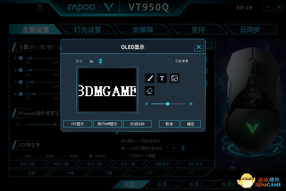 VT950Q标志性的可定制OLED屏幕依然得到了保留,玩家可以在驱动中自由定制这块屏幕显示的内容,默认状态下这块屏幕也可以显示鼠标当前的DPI等级,比起调一下晃晃鼠标这种方式显然更直观了。
