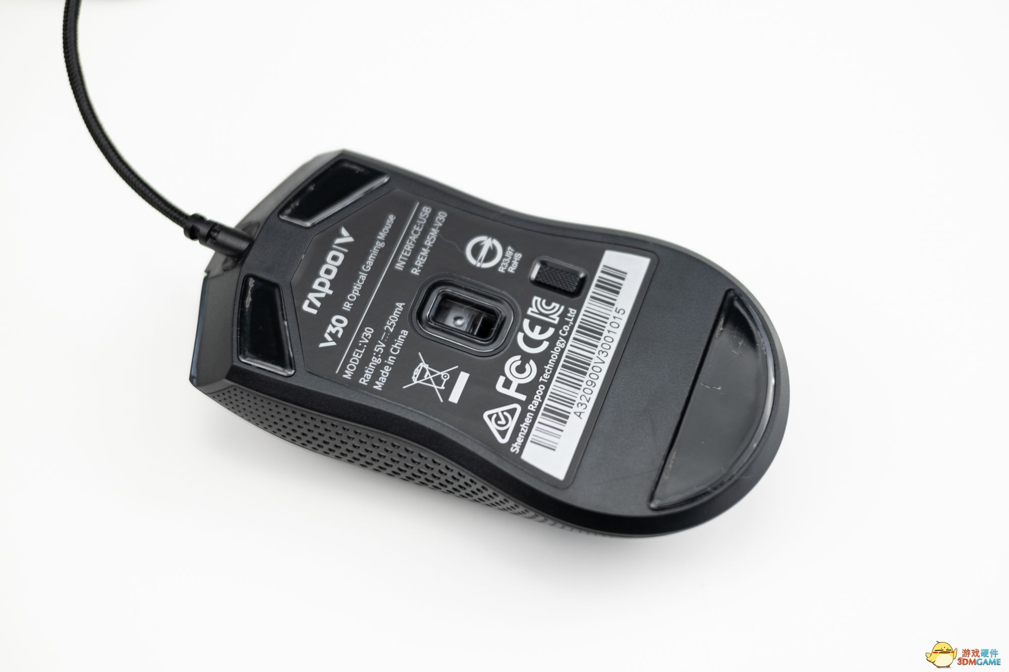 在线材设计部分,雷柏V30 RGB还有一个非常用心的小设计,在鼠标端的线材连接处做了一个小幅度上翘的设计,这样一个小设计可以有效的减少线材和桌面的摩擦,保证鼠标移动的顺畅。
