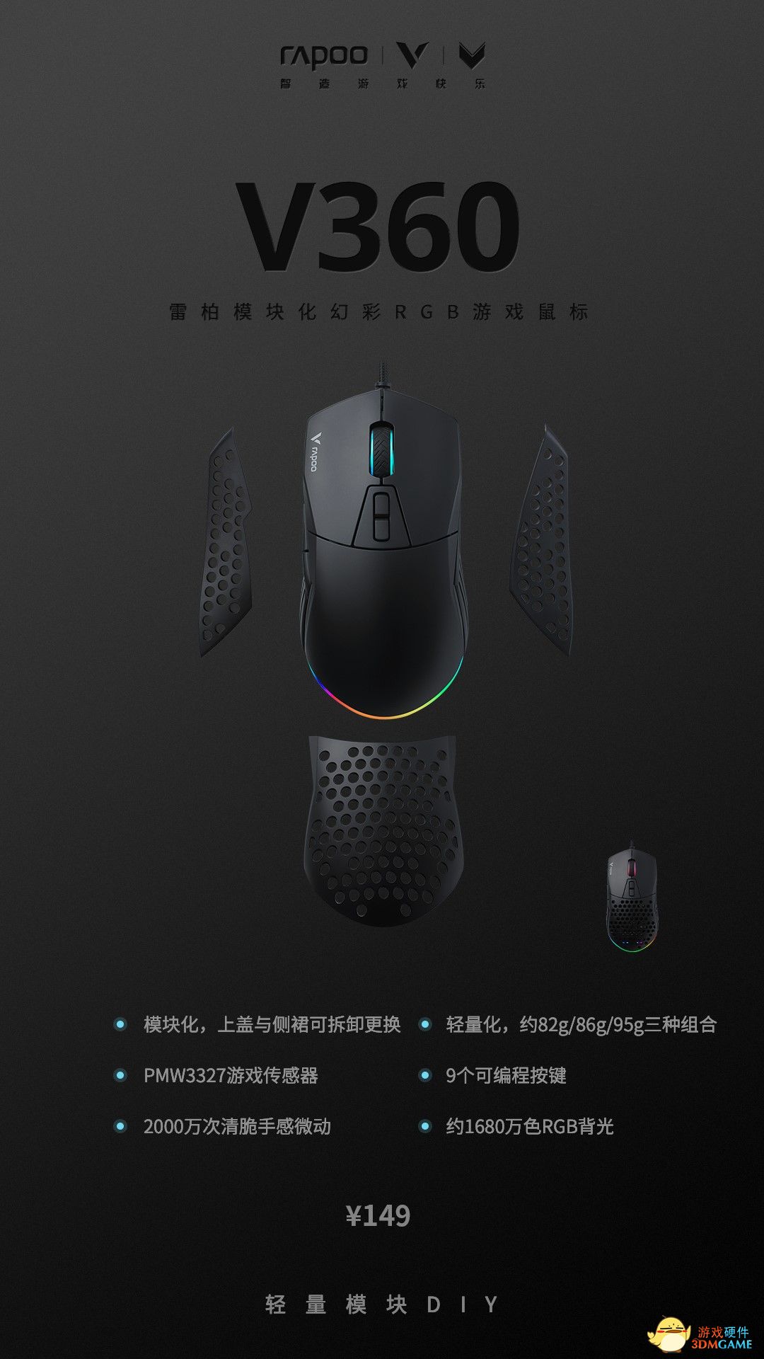 雷柏V360已正式上市,采用模块化DIY组件,轻量化设计,组合多达8种手感,PMW3327游戏传感器,9个可编程按键,2000万次清脆手感微动,个性化的背光系统,再加上149元的诚意价格,无疑是近期游戏鼠标市场的重磅巨作,感兴趣的玩家们千万不要错过!