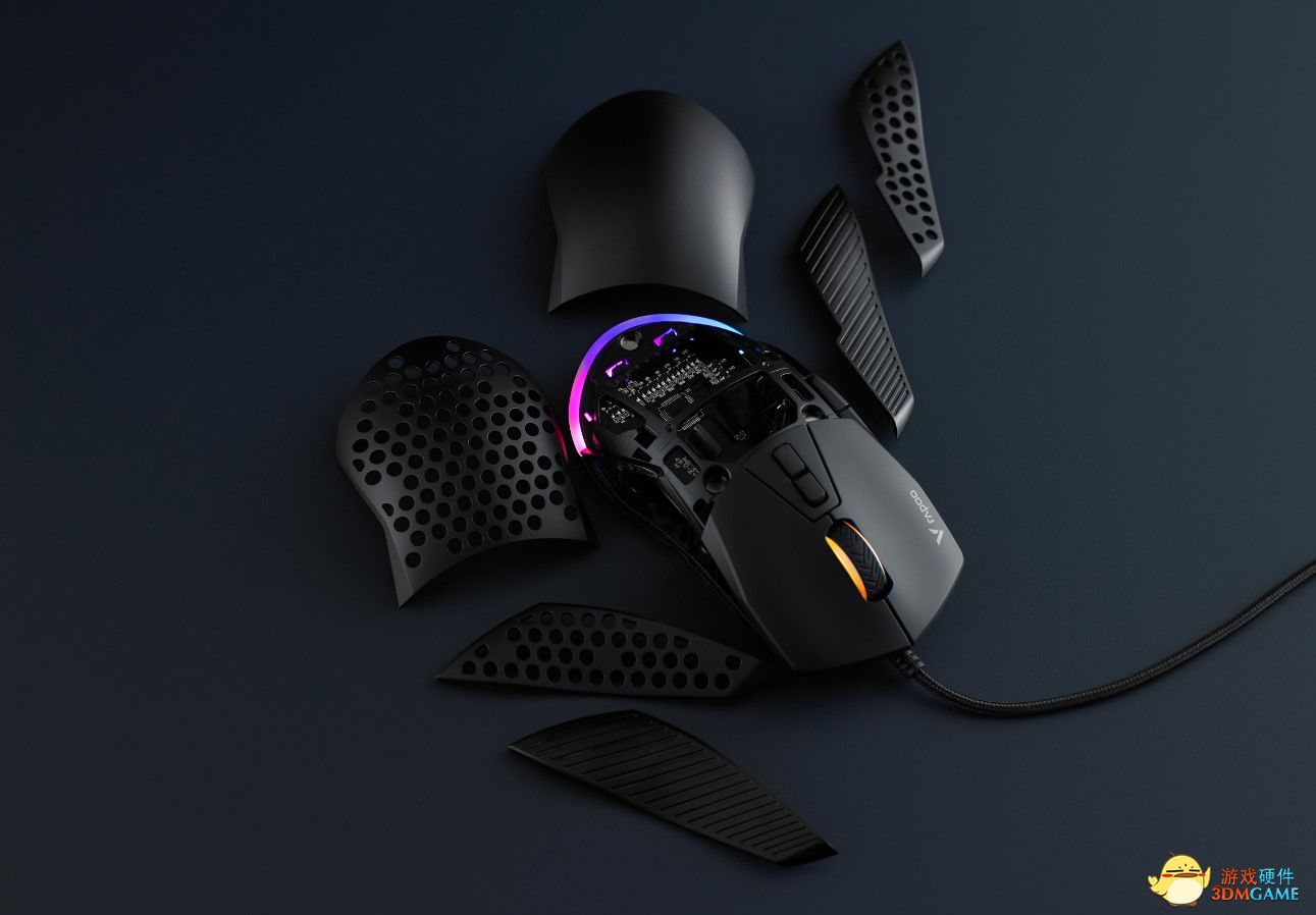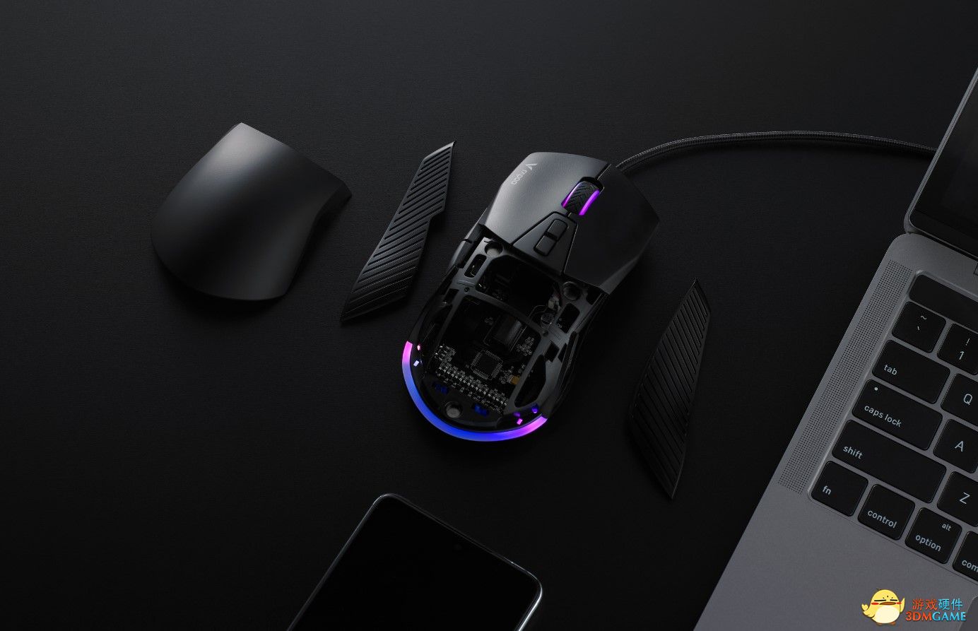 V360最令人惊喜的无疑是机身采用模块化设计,左侧裙、右侧裙、尾部顶盖3个区域,皆采用磁吸式模组设计,可组合出8种不同的手感形态。在可更换组件中,实心的左右侧裙采用条纹状设计,具备透气排汗效果,提供更为出色的防滑性能,持久使用亦不易磨损。不论是抓握、趴握、还是捏握,皆能收获美好操控手感。