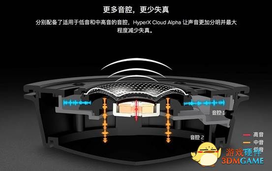 HyperX Cloud Alpha阿尔法耳机最大的特点就是采用了突破性的双音腔设计,这在电竞耳机产品中极为罕见。其内部分别配备了适用于低音和中、高音的音腔,从而让声音层次更加分明,最大程度减少失真,提供传统了传统耳机所不具备的宽广声场和细节音效,全面提升PC、游戏主机和移动端玩家的游戏体验。